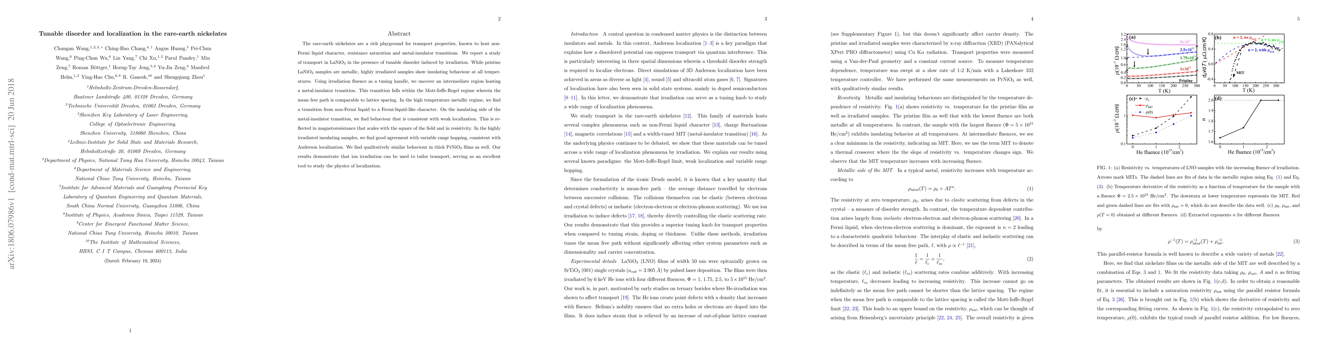 The rare-earth nickelates are a rich playground for transport properties, known to host non-Fermi liquid character, resistance saturation and metal-insulator transitions. We report a study of transport in LaNiO3 in the presence of tunable disorder induced by irradiation. While pristine LaNiO3 samples are metallic, highly irradiated samples show insulating behaviour at all temperatures. Using irradiation fluence as a tuning handle, we uncover an intermediate region hosting a metal-insulator transition. This transition falls within the Mott-Ioffe-Regel regime wherein the mean free path is comparable to lattice spacing. In the high temperature metallic regime, we find a transition from non-Fermi liquid to a Fermi-liquid-like character. On the insulating side of the metal-insulator transition, we find behaviour that is consistent with weak localization. This is reflected in magnetoresistance that scales with the square of the field and in resistivity. In the highly irradiated insulating samples, we find good agreement with variable range hopping, consistent with Anderson localization. We find qualitatively similar behaviour in thick PrNiO3 films as well. Our results demonstrate that ion irradiation can be used to tailor transport, serving as an excellent tool to study the physics of localization.