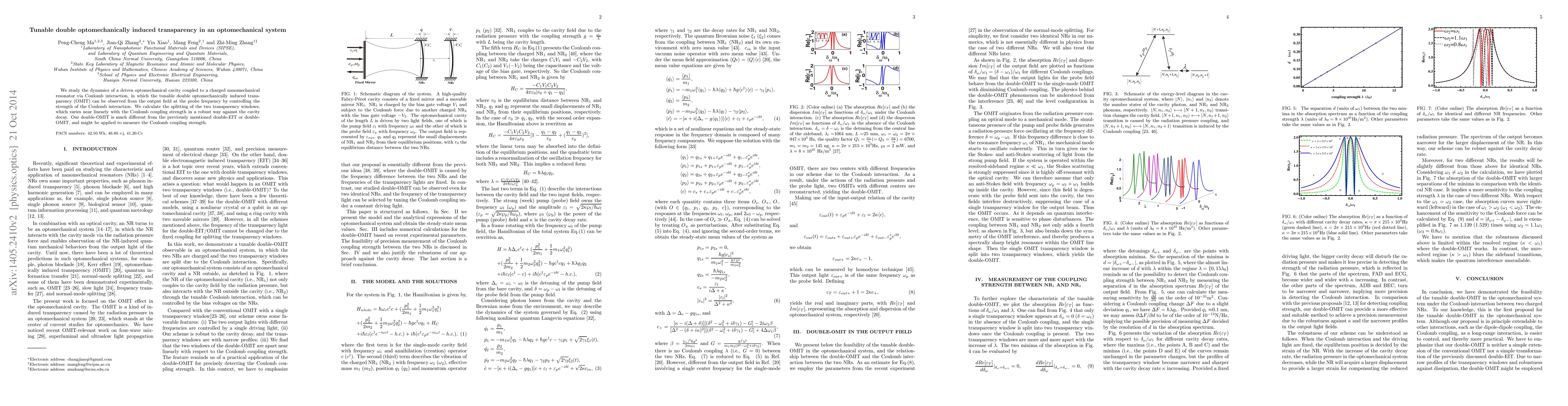 This research investigates a driven optomechanical system where tunable double optomechanically induced transparency (OMIT) occurs, enabling precise measurement of Coulomb interaction strength. The system shows a linear relationship between the transparency windows' splitting and the Coulomb coupling strength, which remains robust against cavity decay.