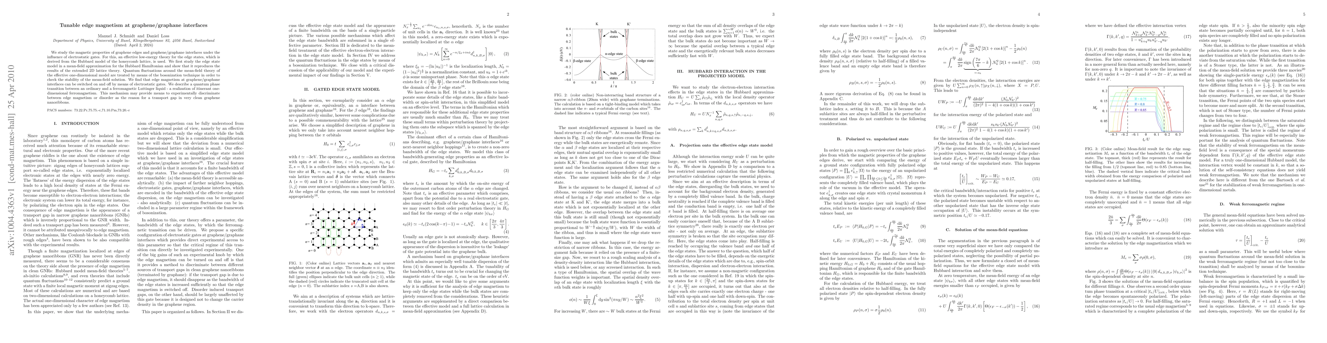 We study the magnetic properties of graphene edges and graphene/graphane interfaces under the influence of electrostatic gates. For this, an effective low-energy theory for the edge states, which is derived from the Hubbard model of the honeycomb lattice, is used. We first study the edge state model in a mean-field approximation for the Hubbard Hamiltonian and show that it reproduces the results of the extended 2D lattice theory. Quantum fluctuations around the mean-field theory of the effective one-dimensional model are treated by means of the bosonization technique in order to check the stability of the mean-field solution. We find that edge magnetism at graphene/graphane interfaces can be switched on and off by means of electrostatic gates. We describe a quantum phase transition between an ordinary and a ferromagnetic Luttinger liquid - a realization of itinerant one-dimensional ferromagnetism. This mechanism may provide means to experimentally discriminate between edge magnetism or disorder as the reason for a transport gap in very clean graphene nanoribbons.