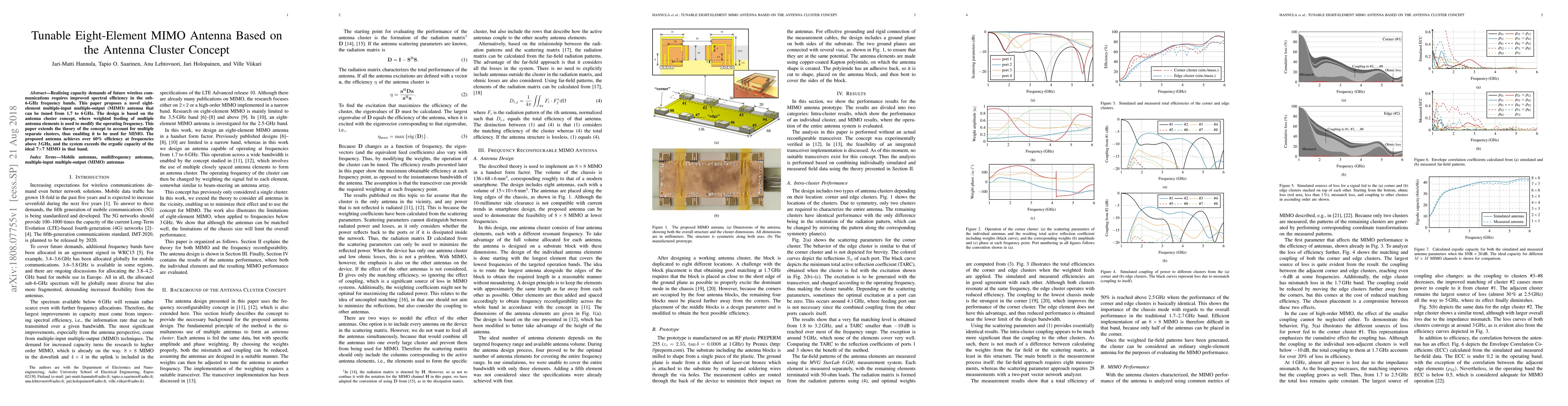 The paper extends the antenna cluster concept to MIMO, proposing a tunable eight-element MIMO antenna with high efficiency and capacity above 3 GHz.