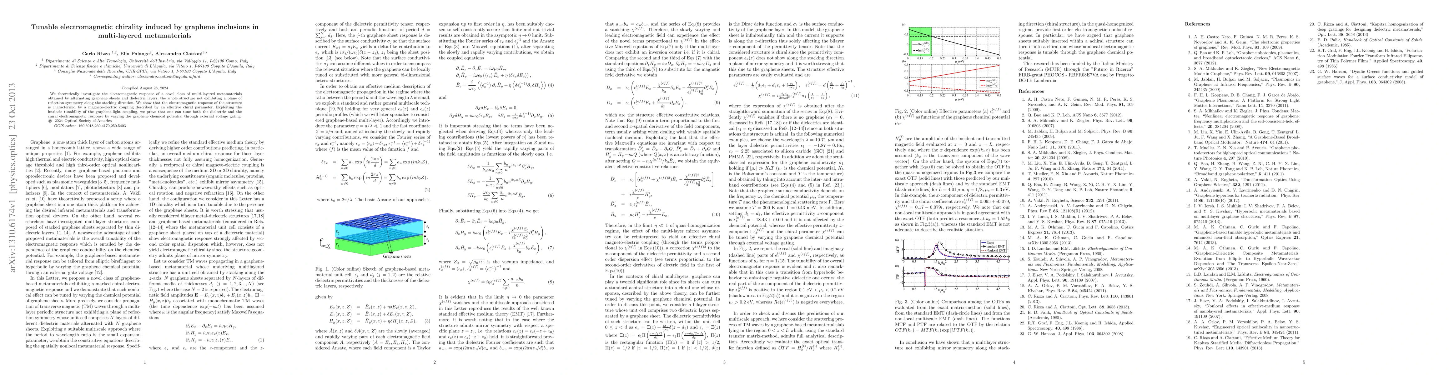 This paper explores multi-layered metamaterials with alternating graphene sheets and dielectric layers, demonstrating a tunable electromagnetic chirality via graphene's tunable chemical potential, achieved through external voltage gating. The structure exhibits unique magneto-electric coupling described by an effective chiral parameter.