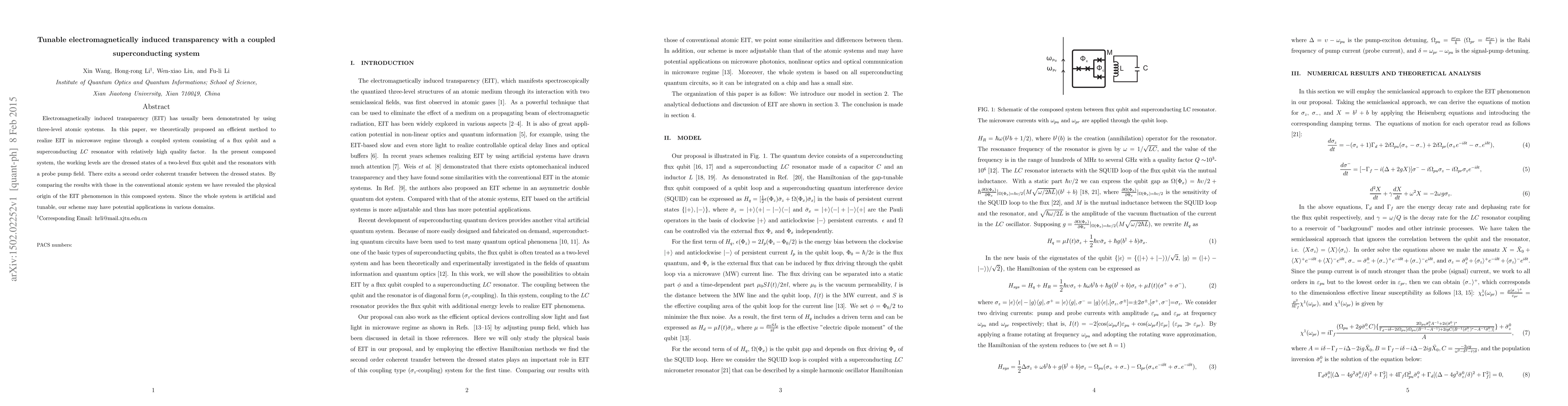 This paper proposes a tunable electromagnetically induced transparency (EIT) method using a coupled superconducting system of a flux qubit and a high-quality factor superconducting LC resonator. The EIT phenomenon is realized through the dressed states of the qubit and resonator, revealing its physical origin and potential applications in various domains.