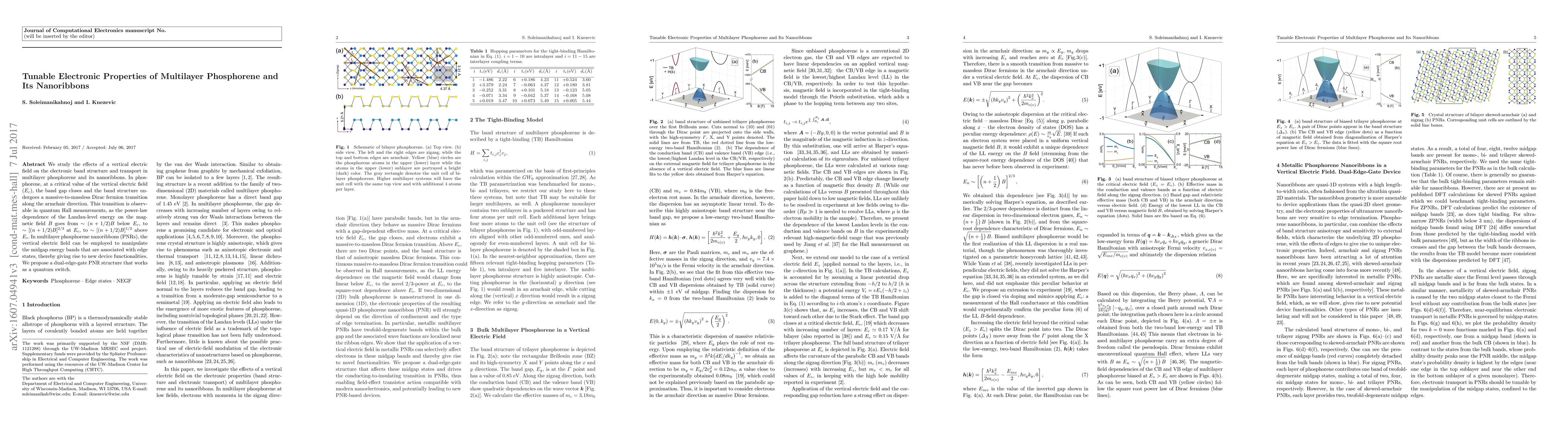 This study investigates the influence of a vertical electric field on the electronic properties of multilayer phosphorene and its nanoribbons, revealing a transition from massive to massless Dirac fermions at a critical field. The vertical electric field also manipulates midgap energy bands in multilayer phosphorene nanoribbons, enabling new device functionalities such as a quantum switch via a dual-edge-gate structure.