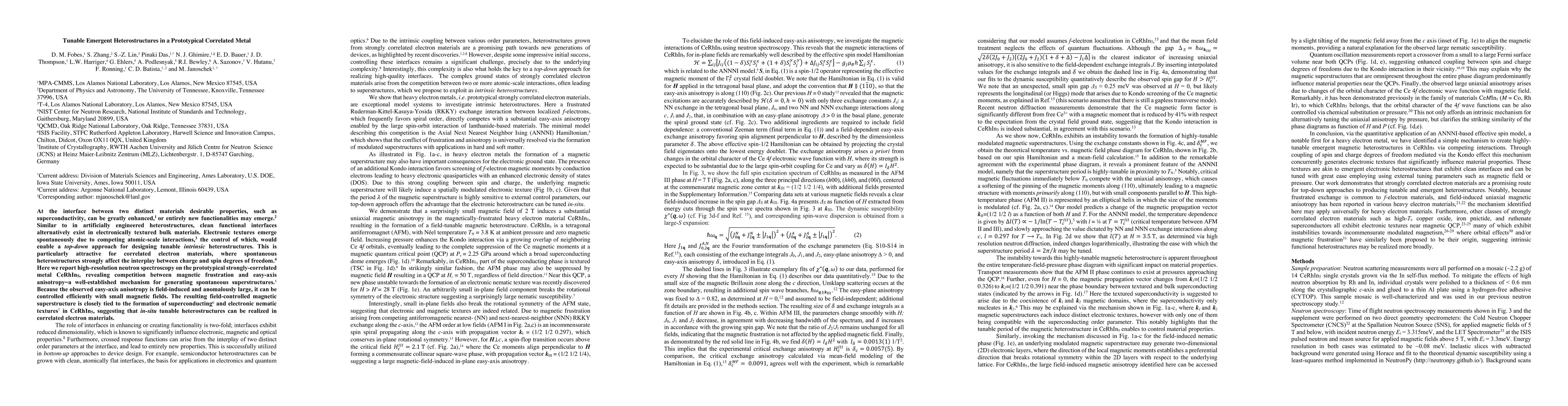 At the interface between two distinct materials desirable properties, such as superconductivity, can be greatly enhanced, or entirely new functionalities may emerge. Similar to in artificially engineered heterostructures, clean functional interfaces alternatively exist in electronically textured bulk materials. Electronic textures emerge spontaneously due to competing atomic-scale interactions, the control of which, would enable a top-down approach for designing tunable intrinsic heterostructures. This is particularly attractive for correlated electron materials, where spontaneous heterostructures strongly affect the interplay between charge and spin degrees of freedom. Here we report high-resolution neutron spectroscopy on the prototypical strongly-correlated metal CeRhIn5, revealing competition between magnetic frustration and easy-axis anisotropy -- a well-established mechanism for generating spontaneous superstructures. Because the observed easy-axis anisotropy is field-induced and anomalously large, it can be controlled efficiently with small magnetic fields. The resulting field-controlled magnetic superstructure is closely tied to the formation of superconducting and electronic nematic textures in CeRhIn5, suggesting that in-situ tunable heterostructures can be realized in correlated electron materials.