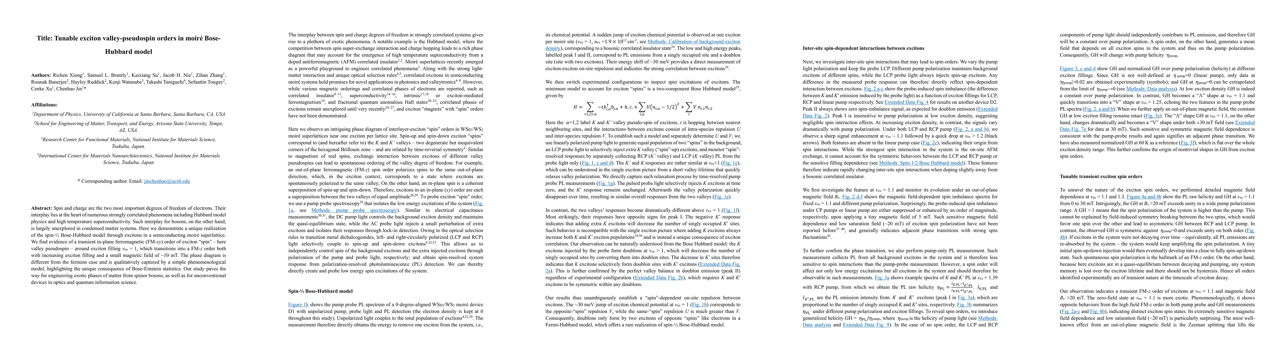 Spin and charge are the two most important degrees of freedom of electrons. Their interplay lies at the heart of numerous strongly correlated phenomena including Hubbard model physics and high temperature superconductivity. Such interplay for bosons, on the other hand, is largely unexplored in condensed matter systems. Here we demonstrate a unique realization of the spin-1/2 Bose-Hubbard model through excitons in a semiconducting moir\'e superlattice. We find evidence of a transient in-plane ferromagnetic (FM-$xy$) order of exciton spin - here valley pseudospin - around exciton filling $\nu_{ex}$ = 1, which transitions into a FM-$z$ order both with increasing exciton filling and a small magnetic field of 10 mT. The phase diagram is different from the fermion case and is qualitatively captured by a simple phenomenological model, highlighting the unique consequence of Bose-Einstein statistics. Our study paves the way for engineering exotic phases of matter from spinor bosons, as well as for unconventional devices in optics and quantum information science.