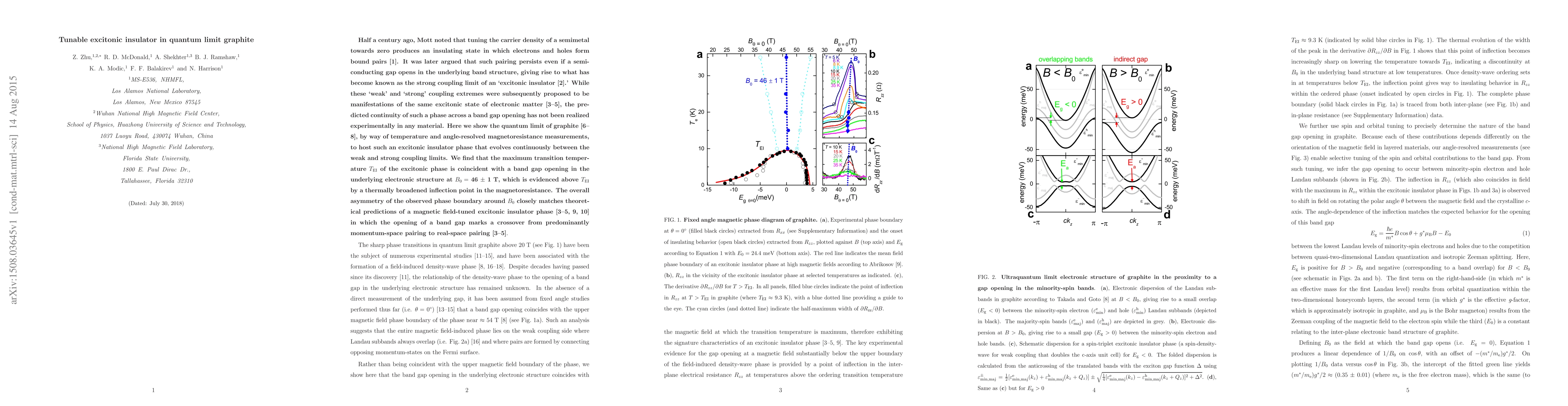 This paper demonstrates that quantum limit graphite exhibits a tunable excitonic insulator phase, transitioning continuously between weak and strong coupling limits. The study finds a maximum transition temperature coinciding with a band gap opening at 46 +/- 1 T, supported by magnetoresistance measurements.