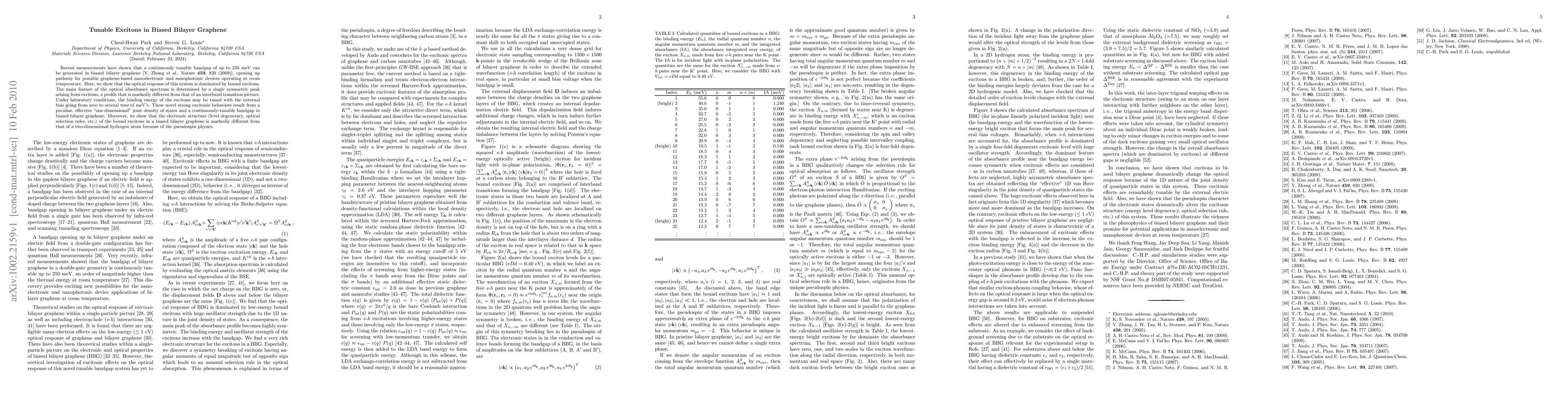 This study reveals that biased bilayer graphene exhibits tunable excitons with a bandgap up to 250 meV, dominated by strong excitonic effects. The optical absorbance spectrum features a single symmetric peak from excitons, distinct from interband transitions, with binding energy tunable by external bias.