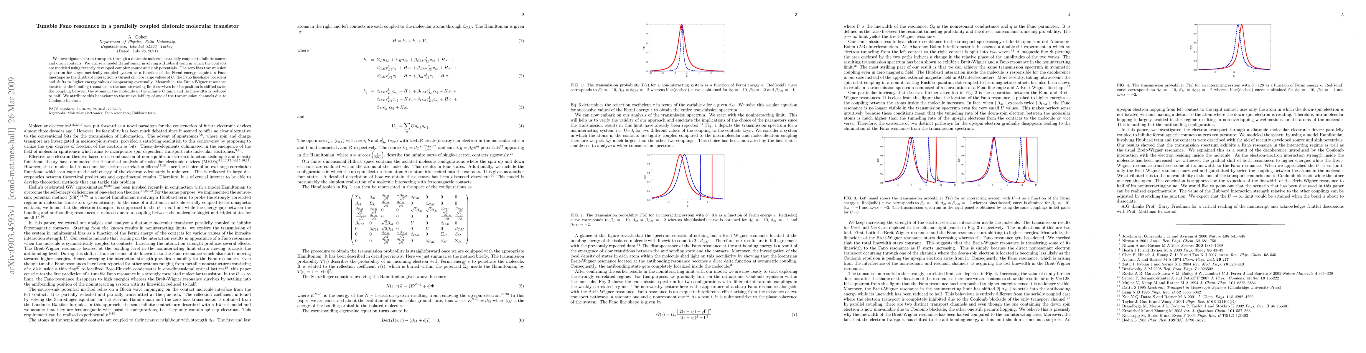 We investigate electron transport through a diatomic molecule parallelly coupled to infinite source and drain contacts. We utilize a model Hamiltonian involving a Hubbard term in which the contacts are modeled using recently developed complex source and sink potentials. The zero bias transmission spectrum for a symmetrically coupled system as a function of the Fermi energy acquires a Fano lineshape as the Hubbard interaction is turned on. For large values of $U$, the Fano lineshape broadens and shifts to higher energy values disappearing eventually. Meanwhile, the Breit-Wigner resonance located at the bonding resonance in the noninteracting limit survives but its position is shifted twice the coupling between the atoms in the molecule in the infinite $U$ limit and its linewidth is reduced to half. We attribute this behaviour to the unavailability of one of the transmission channels due to Coulomb blockade.
