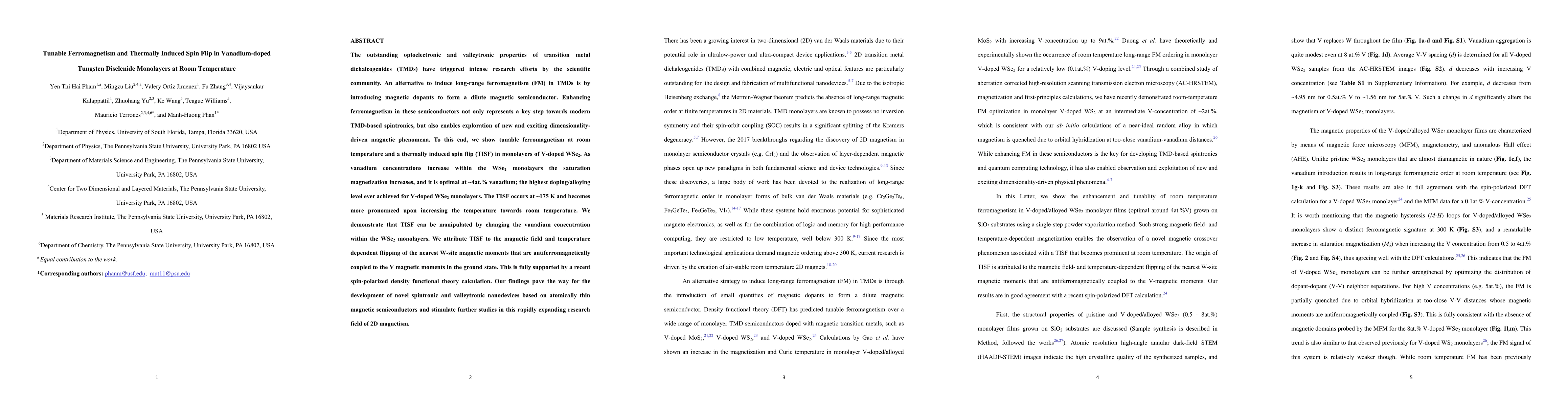 This paper reports tunable ferromagnetism and thermally induced spin flip in vanadium-doped tungsten diselenide monolayers at room temperature, achieved by doping up to 4at.% vanadium, which enhances saturation magnetization and enables manipulation of spin flip behavior through temperature changes.