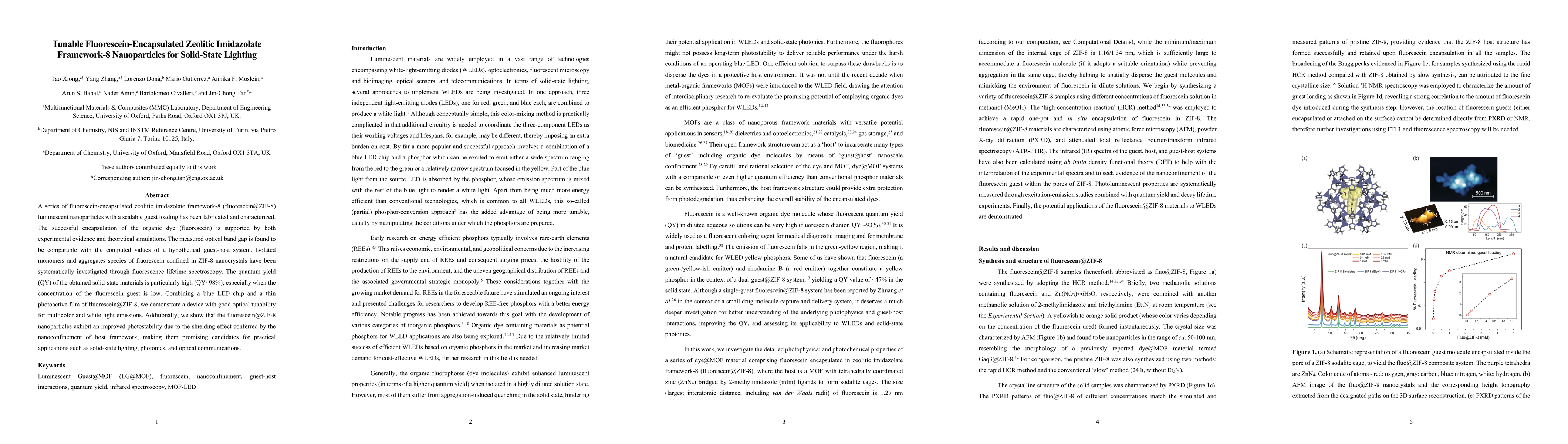 This paper presents fluorescein-encapsulated zeolitic imidazolate framework-8 nanoparticles with high quantum yield and tunable optical properties for solid-state lighting applications. The encapsulation results in enhanced photostability and multicolor light emission when combined with a blue LED chip.