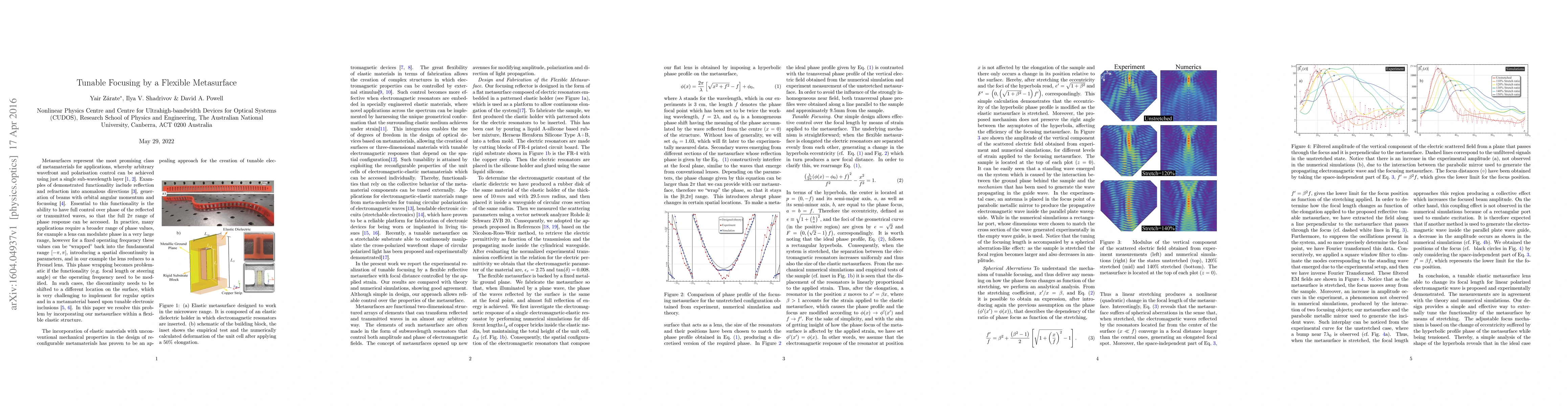 This paper proposes a reflective elastic metasurface with tunable focusing using electric resonators in a stretchable substrate, where the focal length is controlled by stretching. Experimental verification confirms theoretical and simulation predictions, demonstrating the potential of elastic metamaterials for advanced functional devices.