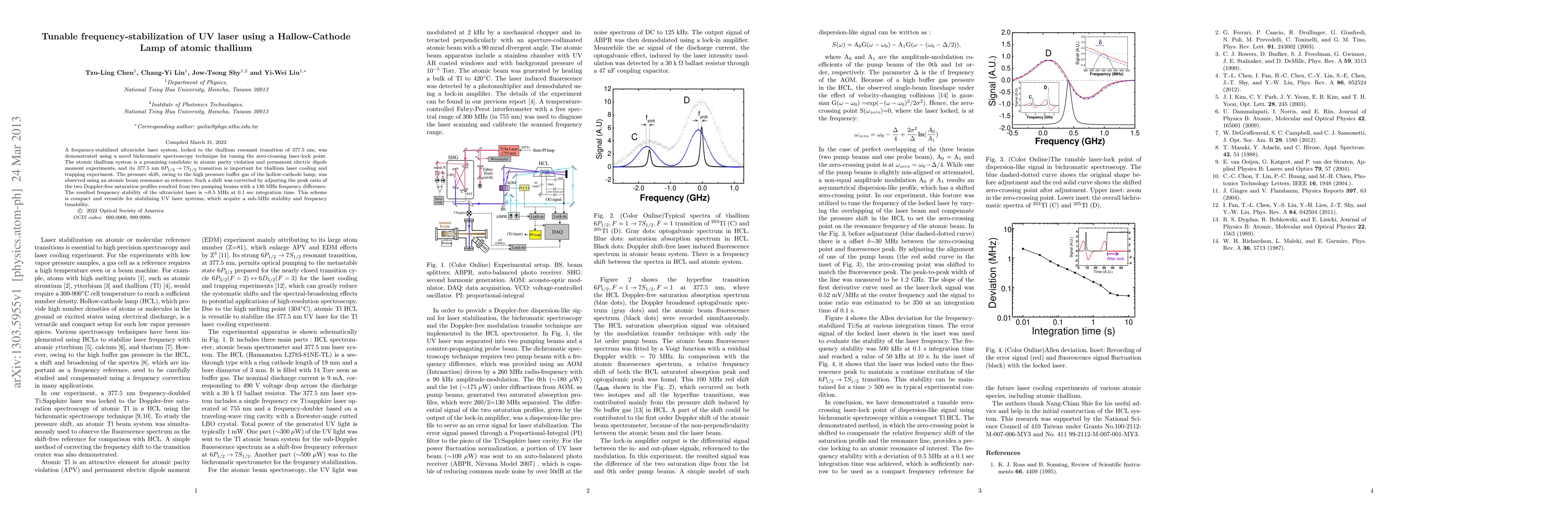 This paper demonstrates a frequency-stabilized ultraviolet laser system locked to the 377.5 nm thallium resonant transition using bichromatic spectroscopy, achieving a stability of 0.5 MHz. The method involves correcting pressure shifts in a hollow-cathode lamp through the adjustment of two Doppler-free saturation profiles, making it compact and versatile for UV laser stabilization.