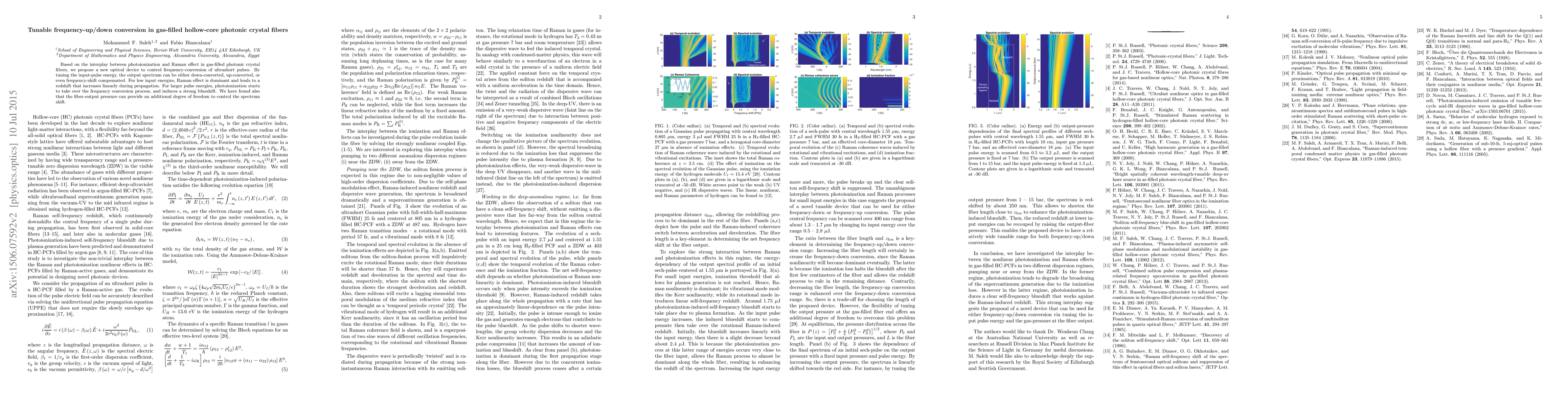 This paper proposes a gas-filled hollow-core photonic crystal fiber device that utilizes photoionization and Raman effects to control frequency-conversion of ultrashort pulses. The output spectrum can be tuned to down-convert, up-convert, or compensate for frequency shifts by adjusting the input pulse energy and fiber-output pressure.