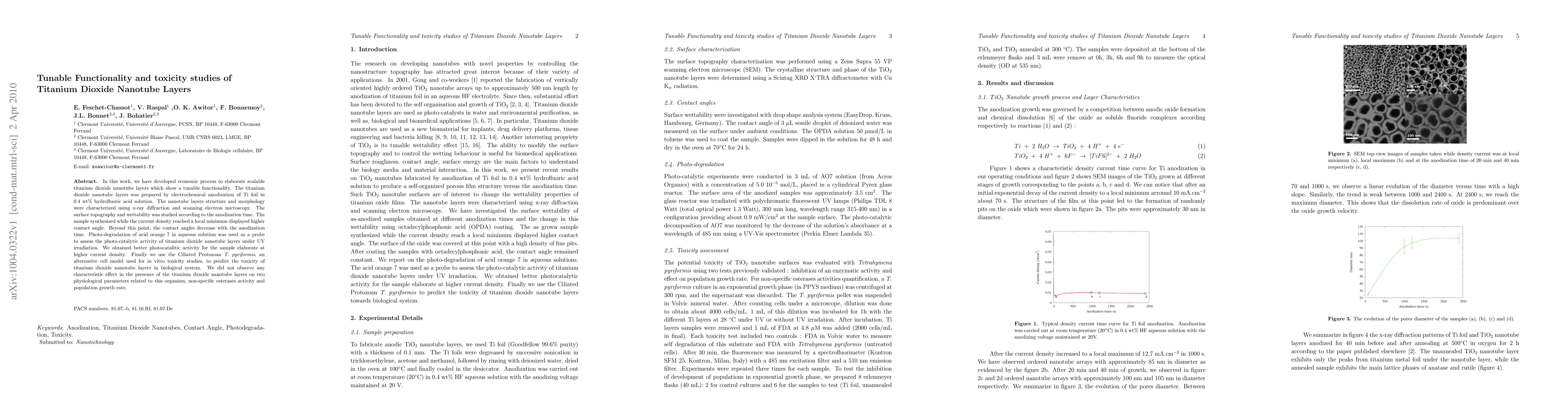 In this work, we have developed economic process to elaborate scalable titanium dioxide nanotube layers which show a tunable functionality. The titanium dioxide nanotube layers was prepared by electrochemical anodization of Ti foil in 0.4 wt% hydrofluoric acid solution. The nanotube layers structure and morphology were characterized using x-ray diffraction and scanning electron microscopy. The surface topography and wettability was studied according to the anodization time. The sample synthesized while the current density reached a local minimum displayed higher contact angle. Beyond this point, the contact angles decrease with the anodization time. Photo-degradation of acid orange 7 in aqueous solution was used as a probe to assess the photo-catalytic activity of titanium dioxide nanotube layers under UV irradiation. We obtained better photocatalitic activity for the sample elaborate at higher current density. Finally we use the Ciliated Protozoan T. pyriformis, an alternative cell model used for in vitro toxicity studies, to predict the toxicity of titanium dioxide nanotube layers in biological system. We did not observe any characteristic effect in the presence of the titanium dioxide nanotube layers on two physiological parameters related to this organism, non-specific esterases activity and population growth rate.