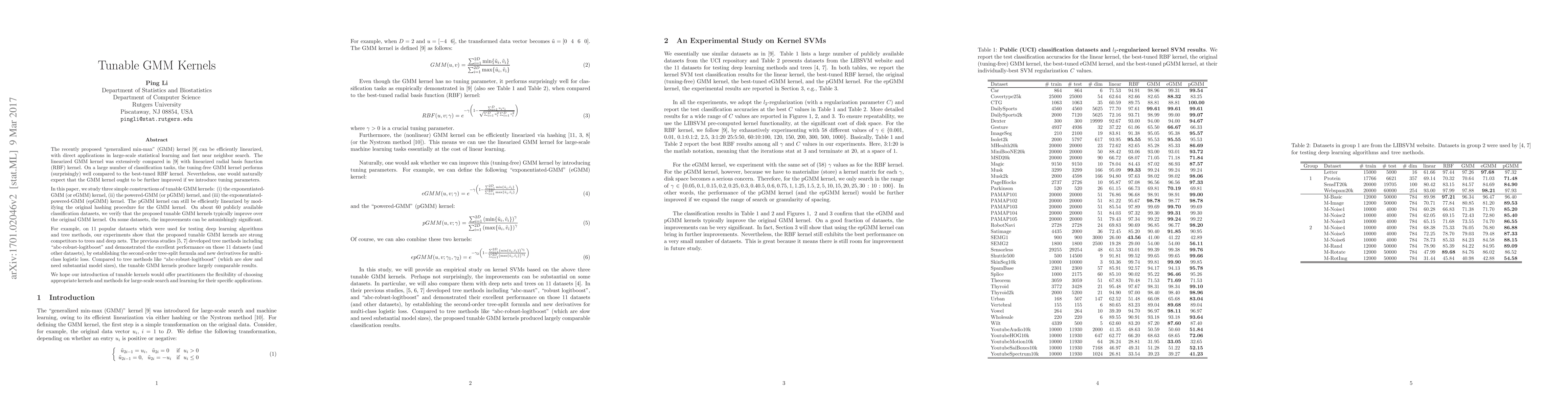 This paper proposes three tunable versions of the generalized min-max (GMM) kernel: eGMM, pGMM, and epGMM, and demonstrates their efficiency and effectiveness in large-scale classification tasks. The pGMM kernel maintains efficient linearization, and across 60 datasets, the tunable GMM kernels often outperform the original GMM kernel, sometimes significantly, rivaling the performance of tree methods like "abc-robust-logitboost" while being faster and more scalable.