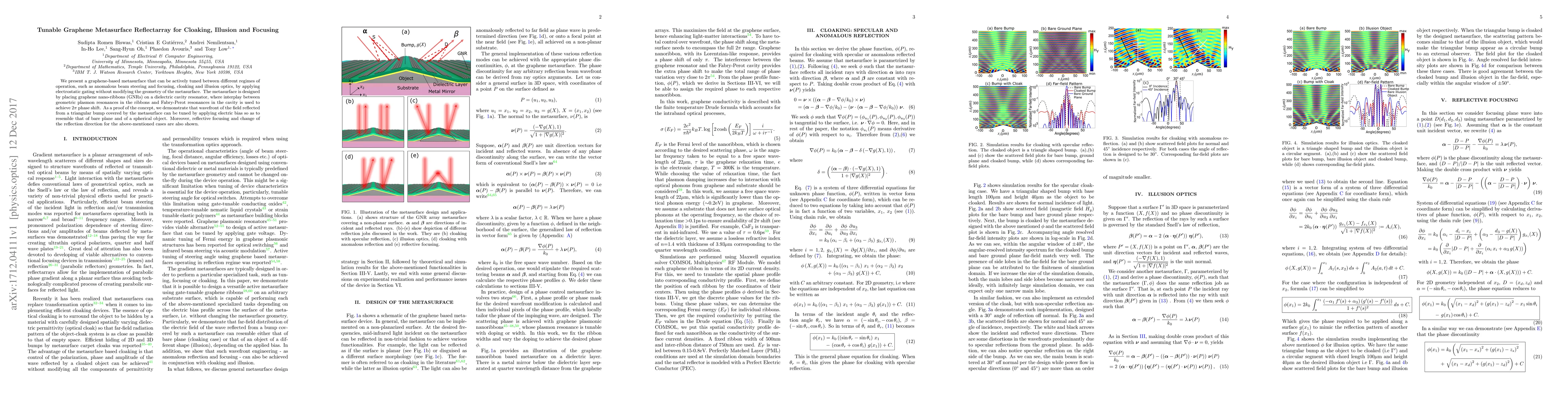 The paper describes a tunable graphene metasurface using electrostatic gating to switch between cloaking, illusion, and focusing, achieving a 2$\pi$ phase shift through graphene nano-ribbons on a dielectric cavity resonator. The metasurface demonstrates controllable wavefront steering, reflective focusing, and directional changes via applied electric bias.
