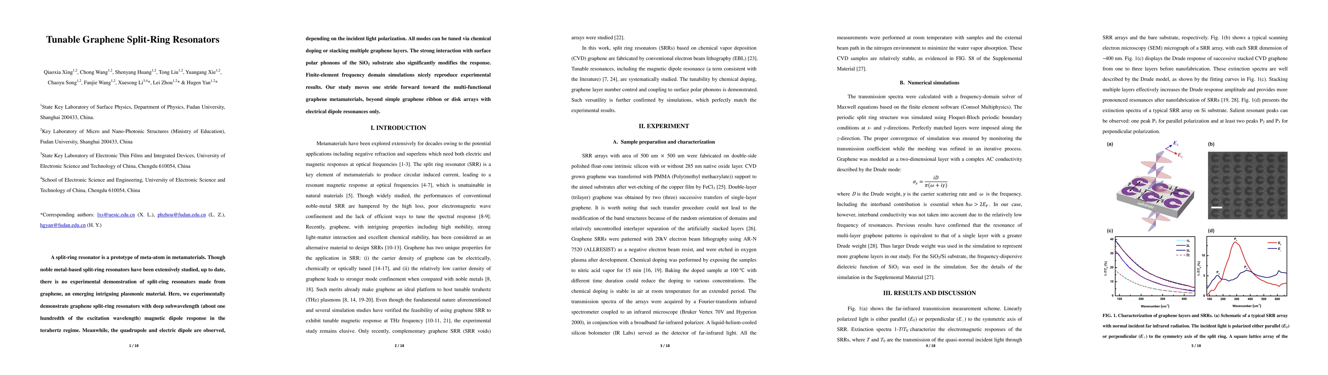This research experimentally demonstrates tunable graphene split-ring resonators exhibiting deep subwavelength magnetic dipole response in the terahertz regime, with observed quadrupole and electric dipole modes depending on polarization, and all modes tunable via chemical doping or graphene layer stacking. Finite-element simulations validate the findings, advancing the development of multifunctional graphene metamaterials.