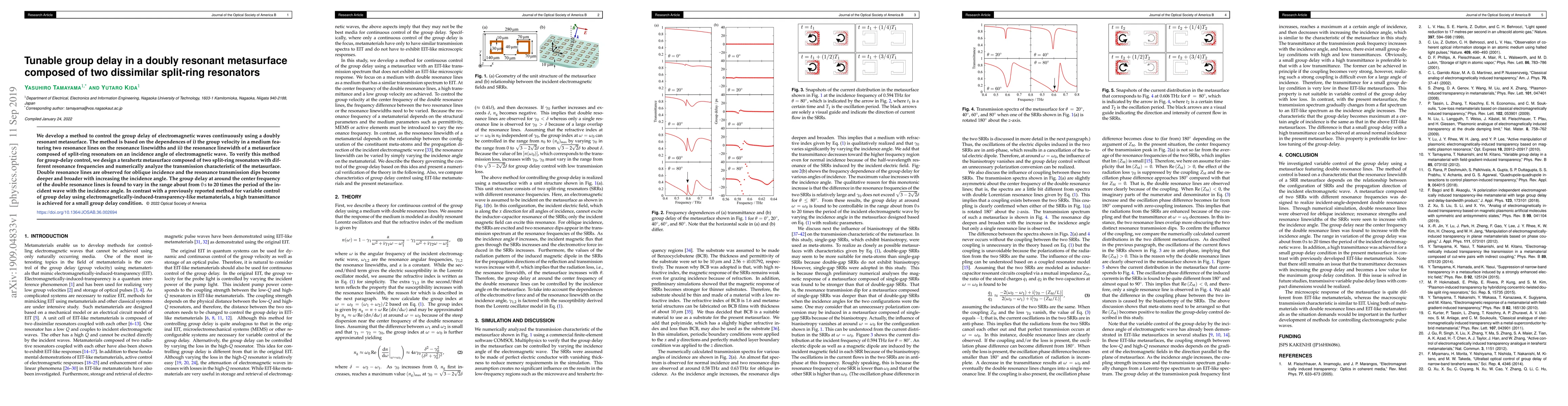 We develop a method to control the group delay of electromagnetic waves continuously using a doubly resonant metasurface. The method is based on the dependences of i) the group velocity in a medium featuring two resonance lines on the resonance linewidths and ii) the resonance linewidth of a metasurface composed of split-ring resonators on an incidence angle of electromagnetic wave. To verify this method for group-delay control, we design a terahertz metasurface composed of two split-ring resonators with different resonance frequencies and numerically analyze the transmission characteristic of the metasurface. Double resonance lines are observed for oblique incidence and the resonance transmission dips become deeper and broader with increasing the incidence angle. The group delay at around the center frequency of the double resonance lines is found to vary in the range about from 0s to 20 times the period of the incident wave with the incidence angle. In contrast with a previously reported method for variable control of group delay using electromagnetically-induced-transparency-like metamaterials, a high transmittance is achieved for a small group delay condition.