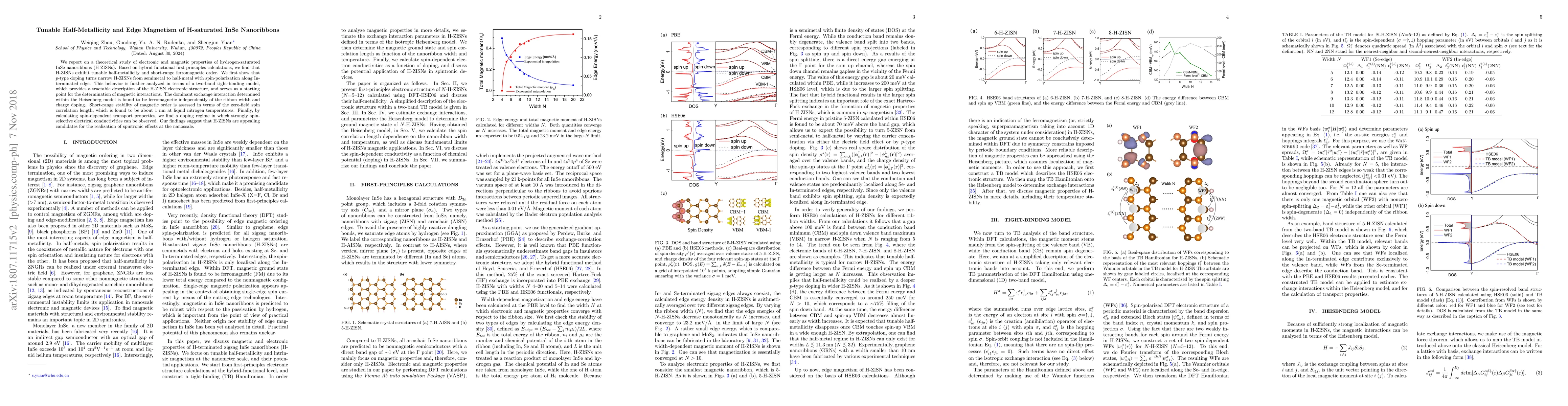 We report on a theoretical study of electronic and magnetic properties of hydrogen-saturated InSe nanoribbons (H-ZISNs). Based on hybrid-functional first-principles calculations, we find that H-ZISNs exhibit tunable half-metallicity and short-range ferromagnetic order. We first show that p-type doping turns narrow H-ZISNs from semimetal to half-metal with spin-polarization along In-terminated edge. This behavior is further analyzed in terms of a two-band tight-binding model, which provides a tractable description of the H-ZISN electronic structure, and serves as a starting point for the determination of magnetic interactions. The dominant exchange interaction determined within the Heisenberg model is found to be ferromagnetic independently of the ribbon width and charge doping. Short-range stability of magnetic order is assessed in terms of the zero-field spin correlation length, which is found to be about 1 nm at liquid nitrogen temperatures. Finally, by calculating spin-dependent transport properties, we find a doping regime in which strongly spin-selective electrical conductivities can be observed. Our findings suggest that H-ZISNs are appealing candidates for the realization of spintronic effects at the nanoscale.