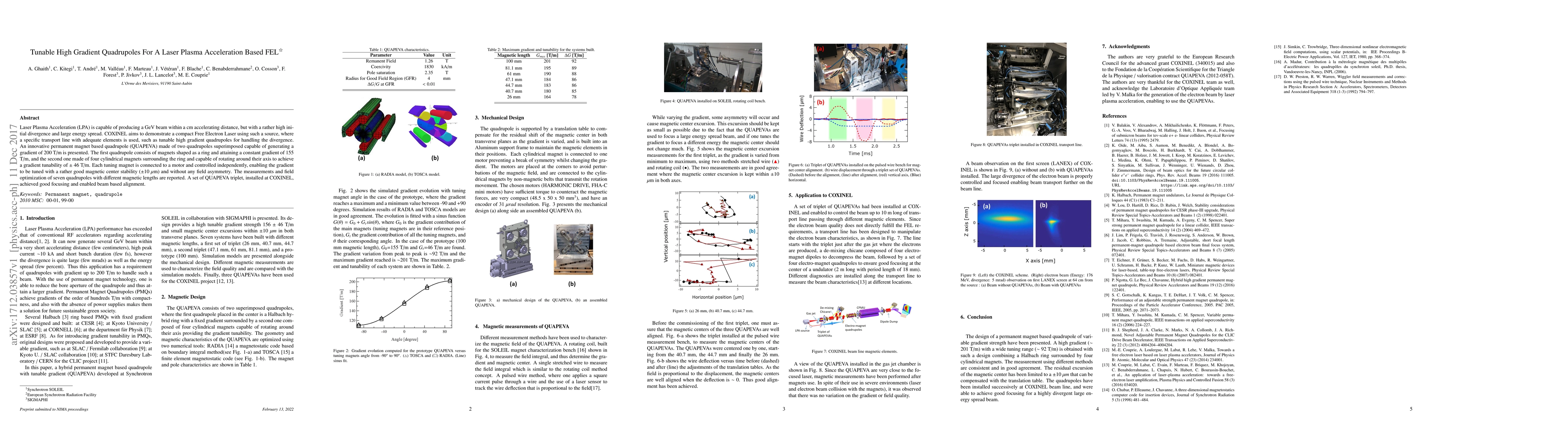 Laser Plasma Acceleration (LPA) is capable of producing a GeV beam within a cm accelerating distance, but with a rather high initial divergence and large energy spread. COXINEL aims to demonstrate a compact Free Electron Laser using such a source, where a specific transport line with adequate elements is used, such as tunable high gradient quadrupoles for handling the divergence. An innovative permanent magnet based quadrupole (QUAPEVA) made of two quadrupoles superimposed capable of generating a gradient of 200 T/m is presented. The first quadrupole consists of magnets shaped as a ring and attaining a constant gradient of 155 T/m, and the second one made of four cylindrical magnets surrounding the ring and capable of rotating around their axis to achieve a gradient tunability of $\pm$ 46 T/m. Each tuning magnet is connected to a motor and controlled independently, enabling the gradient to be tuned with a rather good magnetic center stability ($\pm$10 $\mu$m) and without any field asymmetry. The measurements and field optimization of seven quadrupoles with different magnetic lengths are reported. A set of QUAPEVA triplet, installed at COXINEL, achieved good focusing and enabled beam based alignment.