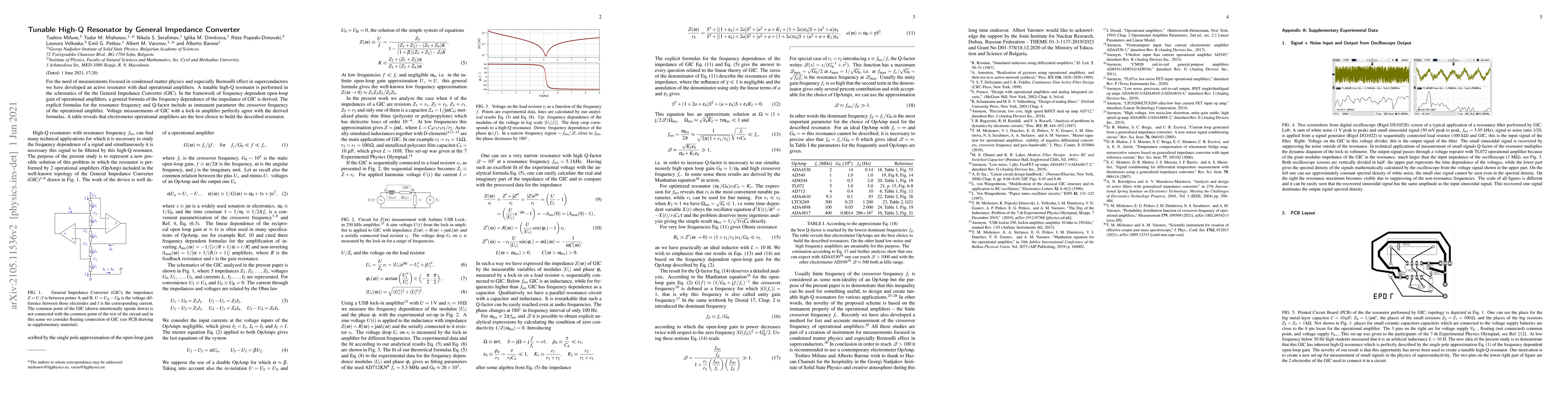 This paper presents a tunable high-Q resonator utilizing a General Impedance Converter (GIC) with dual operational amplifiers for condensed matter physics applications, particularly to study the Bernoulli effect in superconductors. The study derives a formula for the frequency dependence of GIC impedance and demonstrates that electrometer operational amplifiers optimize the resonator's performance.