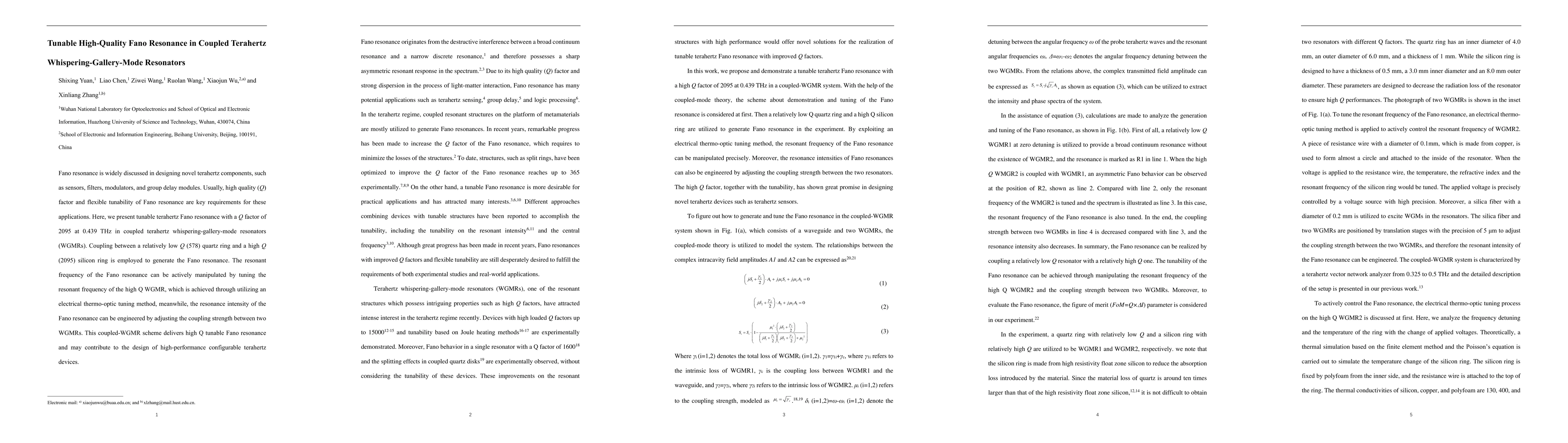This paper presents a method to achieve tunable high-quality Fano resonance in coupled terahertz whispering-gallery-mode resonators, demonstrating a Q factor of 2095 at 0.439 THz. The tunable resonance is achieved by coupling a low Q quartz ring with a high Q silicon ring, and its frequency can be manipulated via an electrical thermo-optic tuning method.