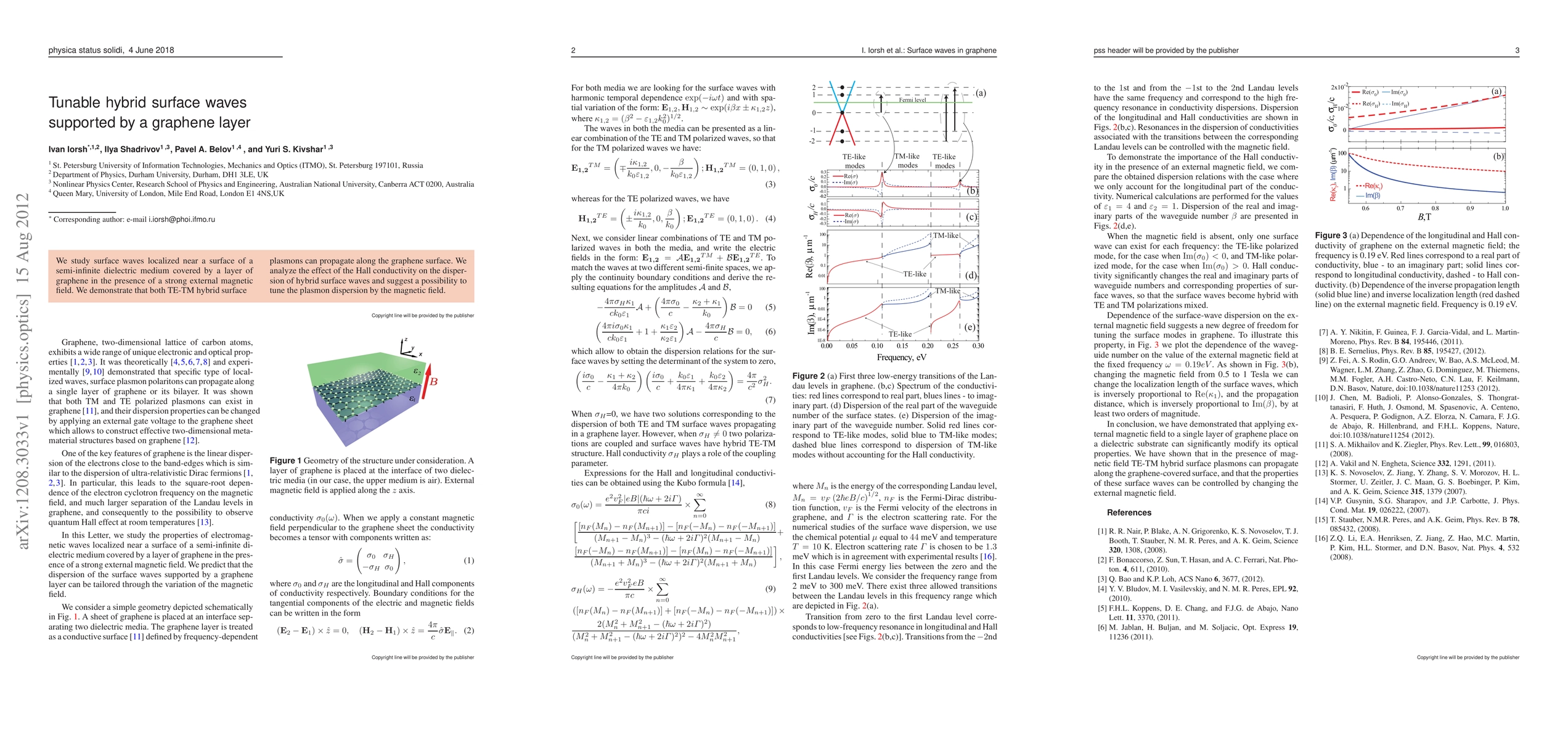 We study surface waves localized near a surface of a semi-infinite dielectric medium covered by a layer of graphene in the presence of a strong external magnetic field. We demonstrate that both TE-TM hybrid surface plasmons can propagate along the graphene surface. We analyze the effect of the Hall conductivity on the disper- sion of hybrid surface waves and suggest a possibility to tune the plasmon dispersion by the magnetic field.