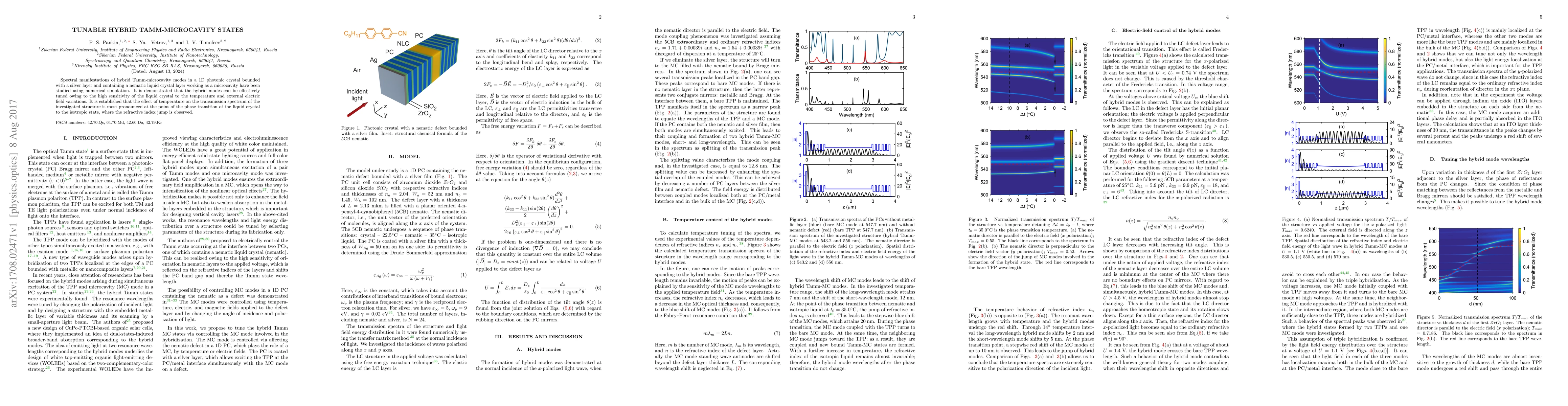 This paper investigates hybrid Tamm-microcavity modes in a 1D photonic crystal with a silver and a nematic liquid crystal layer, demonstrating their tunable spectral properties via temperature and electric field. The study finds that the transmission spectrum is most affected by temperature at the liquid crystal's phase transition to the isotropic state.