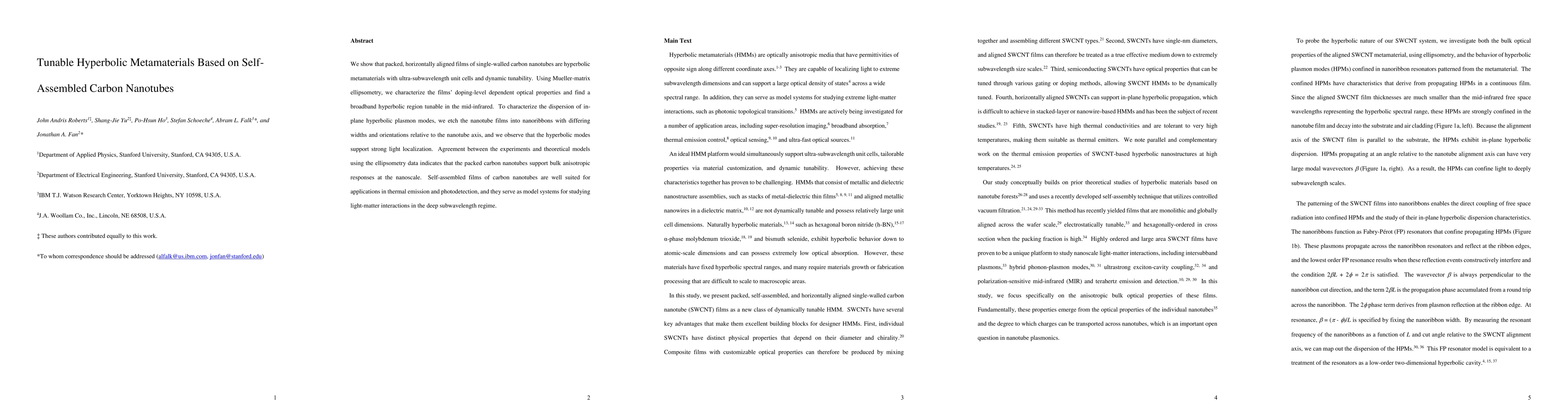 We show that packed, horizontally aligned films of single-walled carbon nanotubes are hyperbolic metamaterials with ultra-subwavelength unit cells and dynamic tunability. Using Mueller-matrix ellipsometry, we characterize the films' doping-level dependent optical properties and find a broadband hyperbolic region tunable in the mid-infrared. To characterize the dispersion of in-plane hyperbolic plasmon modes, we etch the nanotube films into nanoribbons with differing widths and orientations relative to the nanotube axis, and we observe that the hyperbolic modes support strong light localization. Agreement between the experiments and theoretical models using the ellipsometry data indicates that the packed carbon nanotubes support bulk anisotropic responses at the nanoscale. Self-assembled films of carbon nanotubes are well suited for applications in thermal emission and photodetection, and they serve as model systems for studying light-matter interactions in the deep subwavelength regime.