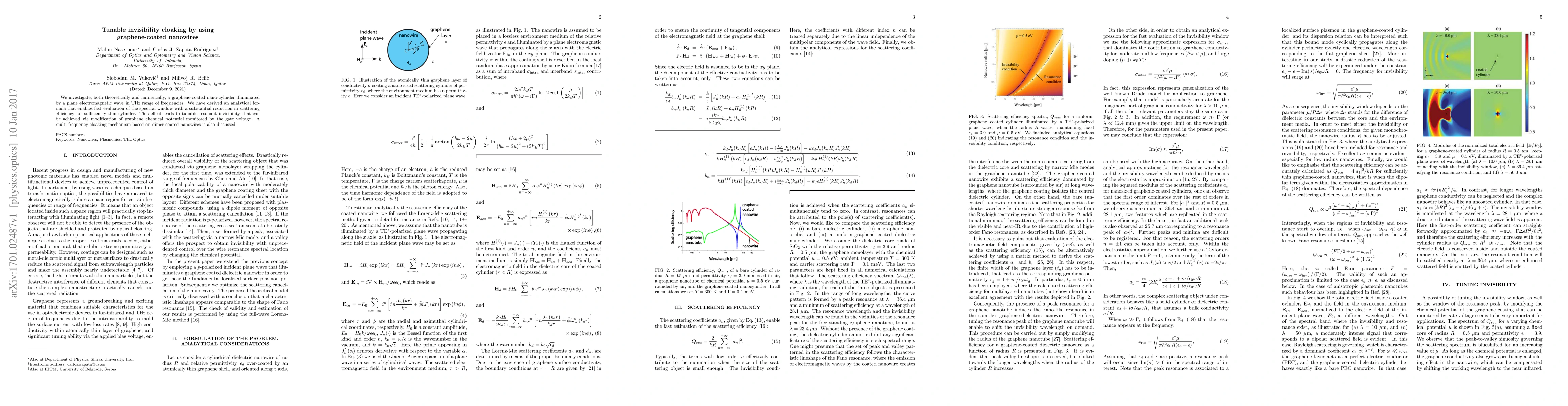 This research proposes a tunable invisibility cloak using graphene-coated nanowires, demonstrating reduced scattering efficiency in the THz range via an analytical formula. The cloaking effect is adjustable through the graphene's chemical potential, controlled by a gate voltage, and extends to multi-frequency cloaking with dimer configurations.
