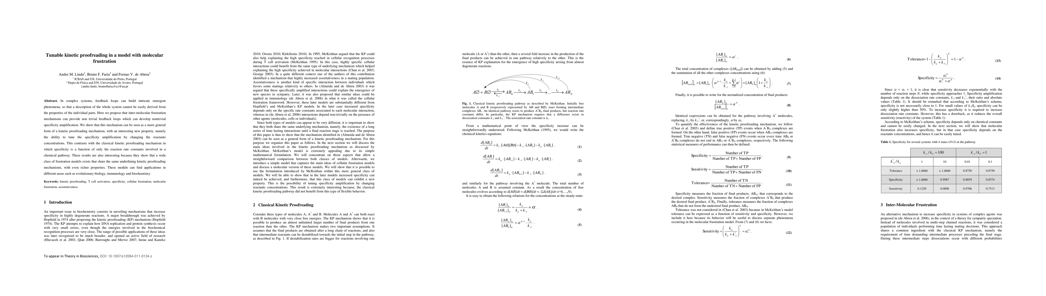 This paper proposes that inter-molecular frustration mechanisms can create intricate feedback loops leading to specificity amplification, presenting a tunable form of kinetic proofreading that adjusts specificity by varying reactant concentrations. This tunable mechanism reveals a broader class of frustration models with rich properties applicable to evolutionary biology, immunology, and biochemistry.