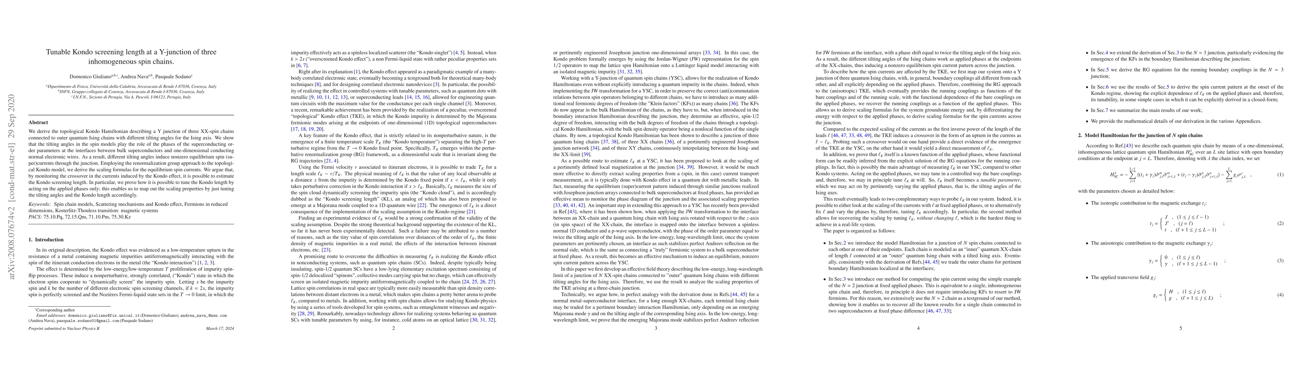 We derive the topological Kondo Hamiltonian describing a Y junction of three XX-spin chains connected to outer quantum Ising chains with different tilting angles for the Ising axis. We show that the tilting angles in the spin models play the role of the phases of the superconducting order parameters at the interfaces between bulk superconductors and one-dimensional conducting normal electronic wires. As a result, different tilting angles induce nonzero equilibrium spin (super)currents through the junction. Employing the renormalization group approach to the topological Kondo model, we derive the scaling formulas for the equilibrium spin currents. We argue that, by monitoring the crossover in the currents induced by the Kondo effect, it is possible to estimate the Kondo screening length. In particular, we prove how it is possible to tune the Kondo length by acting on the applied phases only; this enables us to map out the scaling properties by just tuning the tilting angles and the Kondo length accordingly.