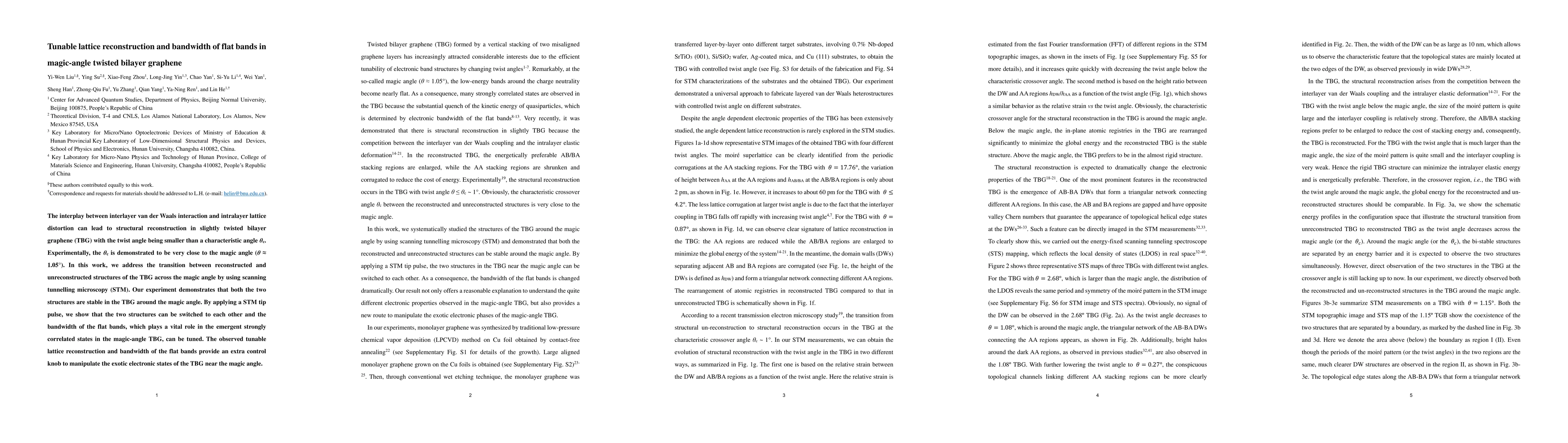 This study demonstrates that the lattice reconstruction in magic-angle twisted bilayer graphene (TBG) can be tuned using a scanning tunnelling microscopy (STM) tip pulse, showing both reconstructed and unreconstructed structures around the magic angle are stable. The experiment reveals that the bandwidth of flat bands, crucial for correlated electronic states, can be adjusted, providing a method to manipulate exotic electronic properties near the magic angle.