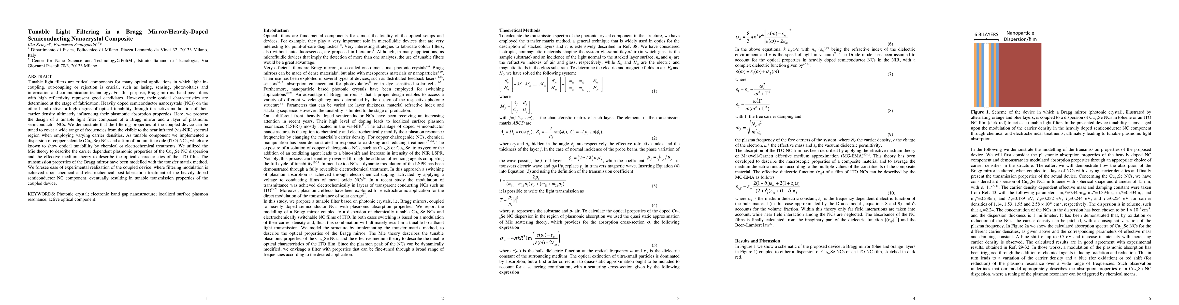 Tunable light filters are critical components for many optical applications in which light in-coupling, out-coupling or rejection is crucial, such as lasing, sensing, photovoltaics and information and communication technology. For this purpose, Bragg mirrors, band-pass filters with high reflectivity represent good candidates. However, their optical characteristics are determined at the stage of fabrication. Heavily doped semiconductor nanocrystals (NCs) on the other hand deliver a high degree of optical tunability through the active modulation of their carrier density ultimately influencing their plasmonic absorption properties. Here, we propose the design of a tunable light filter composed of a Bragg mirror and a layer of plasmonic semiconductor NCs. We demonstrate that the filtering properties of the coupled device can be tuned to cover a wide range of frequencies from the visible to the near infrared (vis-NIR) spectral region when employing varying carrier densities. As tunable component we implemented a dispersion of copper selenide (Cu2-xSe) NCs and a film of indium tin oxide (ITO) NCs, which are known to show optical tunablility by chemical or electrochemical treatments. We utilized the Mie theory to describe the carrier dependent plasmonic properties of the Cu2-xSe NC dispersion and the effective medium theory to describe the optical characteristics of the ITO film. The transmission properties of the Bragg mirror have been modelled with the transfer matrix method. We foresee ease of experimental realization of the coupled device, where filtering modulation is achieved upon chemical and electrochemical post-fabrication treatment of the heavily doped semiconductor NC component, eventually resulting in tunable transmission properties of the coupled device.