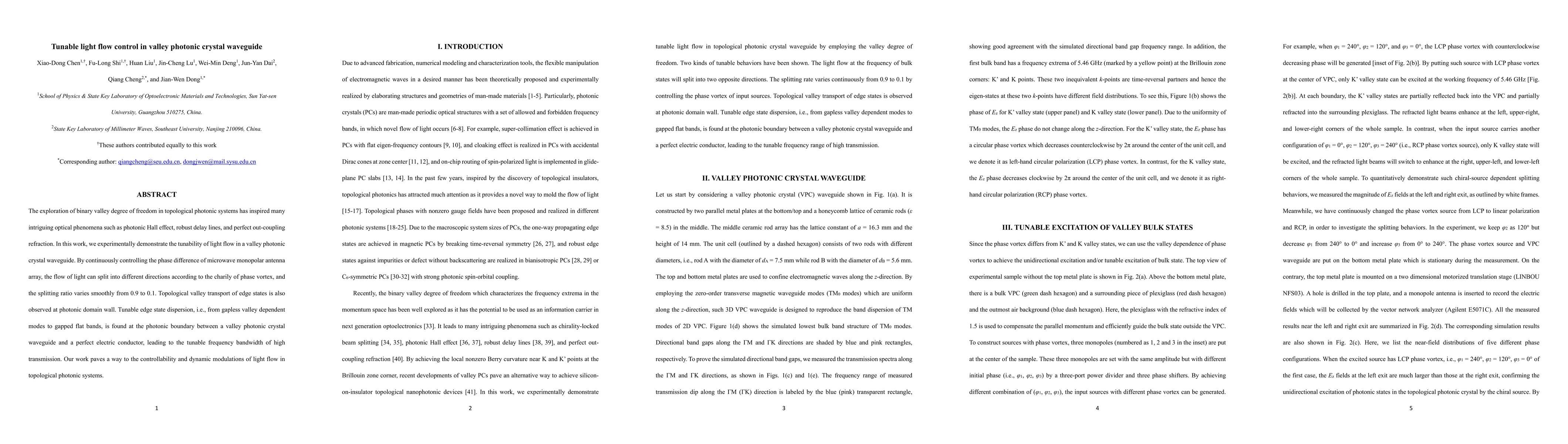 This research demonstrates the tunability of light flow in a valley photonic crystal waveguide using microwave monopolar antenna arrays, showing smooth splitting ratios and topological edge state dispersion, enabling dynamic modulation of photonic systems.