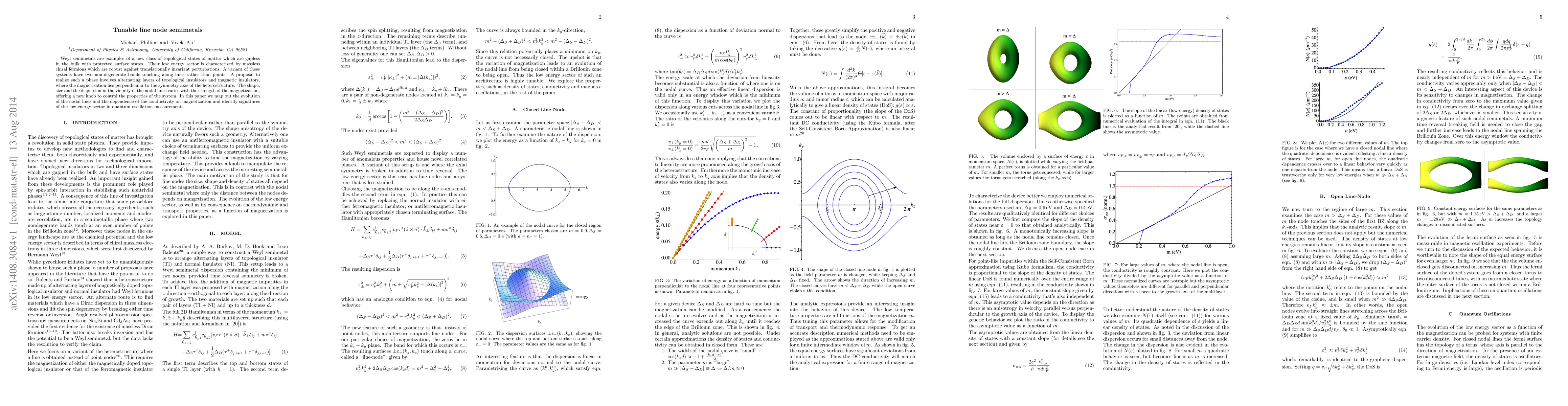 Weyl semimetals are examples of a new class of topological states of matter which are gapless in the bulk with protected surface states. Their low energy sector is characterized by massless chiral fermions which are robust against translationally invariant perturbations. A variant of these systems have two non-degenerate bands touching along lines rather than points. A proposal to realize such a phase involves alternating layers of topological insulators and magnetic insulators, where the magnetization lies perpendicular to the symmetry axis of the heterostructure. The shape, size and the dispersion in the vicinity of the nodal lines varies with the strength of the magnetization, offering a new knob to control the properties of the system. In this paper we map out the evolution of the nodal lines and the dependence of the conductivity on magnetization and identify signatures of the low energy sector in quantum oscillation measurements.