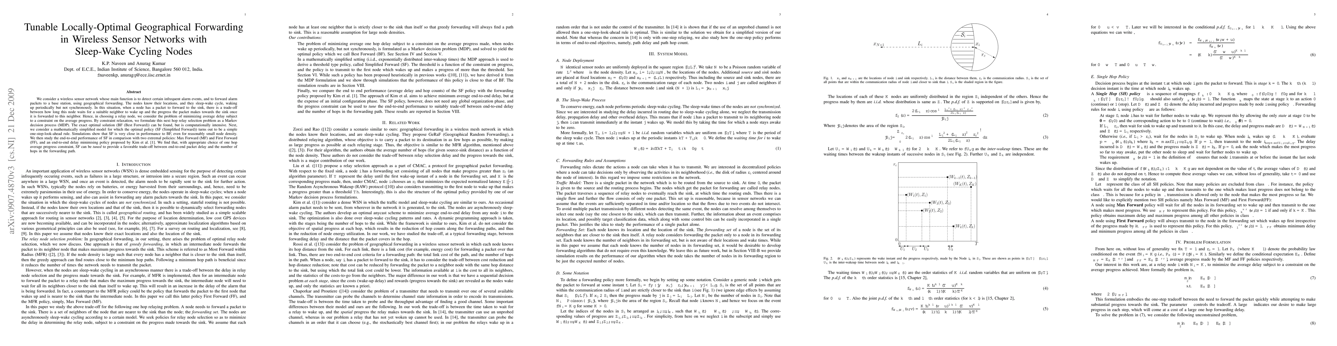 We consider a wireless sensor network whose main function is to detect certain infrequent alarm events, and to forward alarm packets to a base station, using geographical forwarding. The nodes know their locations, and they sleep-wake cycle, waking up periodically but not synchronously. In this situation, when a node has a packet to forward to the sink, there is a trade-off between how long this node waits for a suitable neighbor to wake up and the progress the packet makes towards the sink once it is forwarded to this neighbr. Hence, in choosing a relay node, we consider the problem of minimizing average delay subject to a constraint on the average progress. By constraint relaxation, involving a Lagrange multiplier, we formulate this next hop relay selection problem as a Markov decision process (MDP). The exact optimal solution (BF (Best Forward)) can be found, but is computationally intensive. Next, we consider a mathematically simplified model for which the optimal policy (SF (Simplified Forward)) turns out to be a simple one-step-look-ahead rule. Simulations show that SF is very close in performance to BF, even for reasonably small node density. We then study the end-to-end performance of SF in comparison with two extremal policies: Max Forward (MF), which makes the maximum possible progress per hop and thus reduces network energy consumption, and First Forward (FF), which forwards the packet to the first node to wake up, and thus tends to make end-to-end forwarding delays small. We find that, with appropriate choice of one hop average progress constraint, SF can be tuned to provide a favorable trade-off between end-to-end packet delay and the number of hops in the forwarding path.