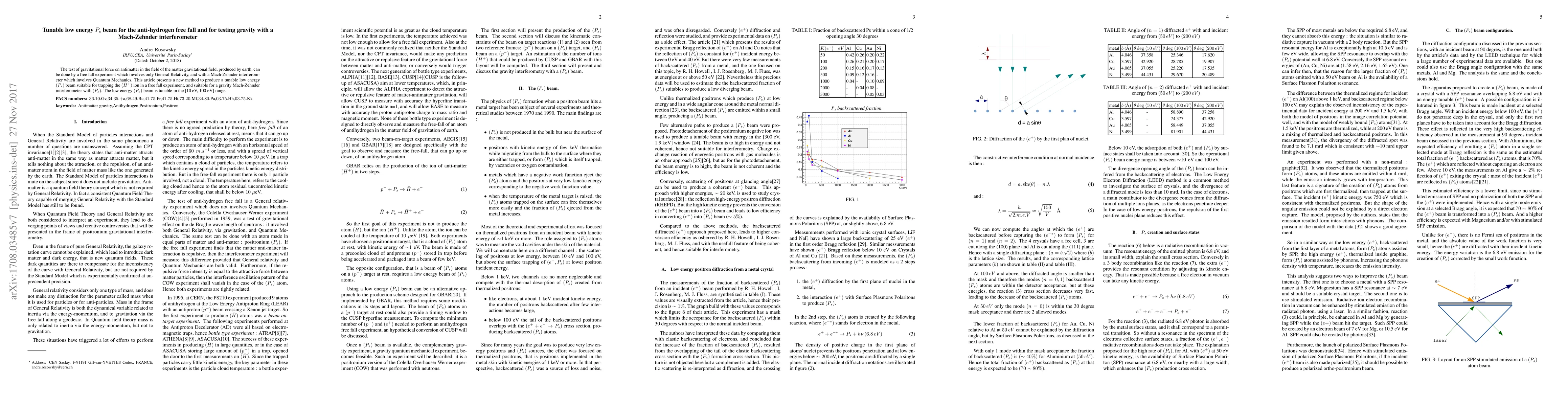 The test of gravitational force on antimatter in the field of the matter gravitational field, produced by earth, can be done by a free fall experiment which involves only General Relativity, and with a Mach-Zehnder interferometer which involves Quantum Mechanics. This article presents a new method to produce a tunable low energy (Ps ) beam suitable for trapping the (Hbar + ) ion in a free fall experiment, and suitable for a gravity Mach-Zehnder interferometer with (Ps). The low energy (Ps) beam is tunable in the [10 eV, 100 eV] range.