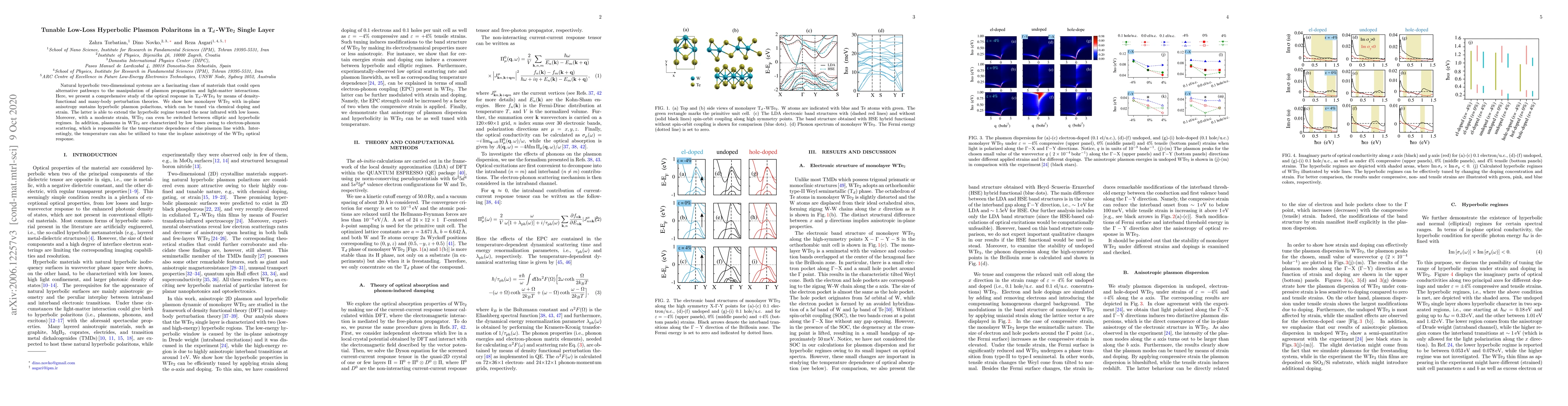 Natural hyperbolic two-dimensional systems are a fascinating class of materials that could open alternative pathways to the manipulation of plasmon propagation and light-matter interactions. Here, we present a comprehensive study of the optical response in T$_d\,$-WTe$_2$ by means of density-functional and many-body perturbation theories. We show how monolayer WTe$_2$ with in-plane anisotropy sustains hyperbolic plasmon polaritons, which can be tuned via chemical doping and strain. The latter is able to extend the hyperbolic regime toward the near infrared with low losses. Moreover, with a moderate strain, WTe$_2$ can even be switched between elliptic and hyperbolic regimes. In addition, plasmons in WTe$_2$ are characterized by low losses owing to electron-phonon scattering, which is responsible for the temperature dependence of the plasmon line width. Interestingly, the temperature can also be utilized to tune the in-plane anisotropy of the WTe$_2$ optical response.