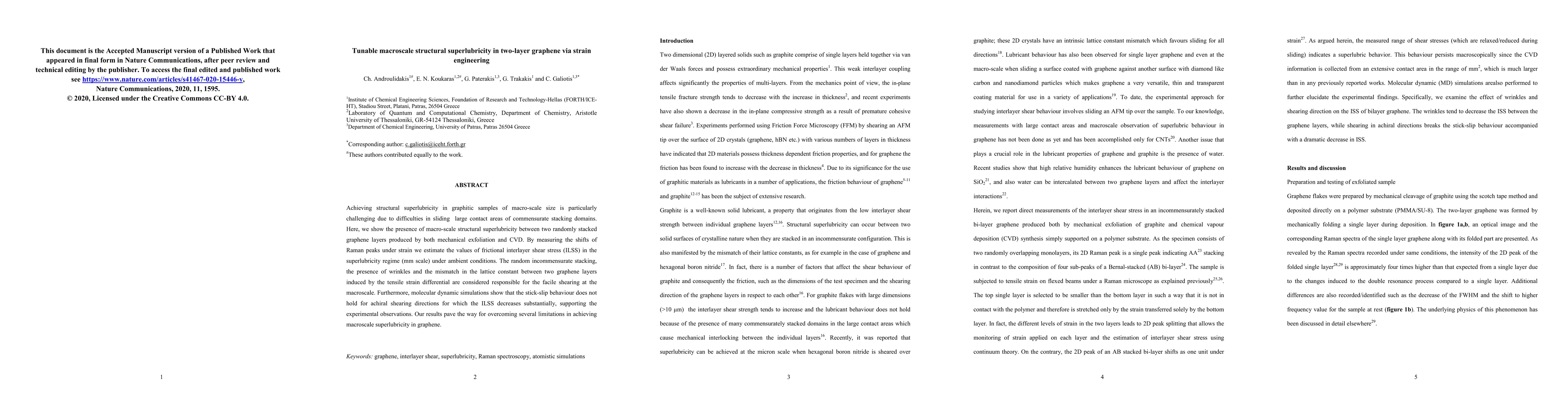 This paper demonstrates the achievement of macroscale structural superlubricity between two randomly stacked graphene layers through strain engineering, revealing that incommensurate stacking, wrinkles, and lattice mismatch due to tensile strain facilitate easy shearing. Molecular dynamics simulations corroborate the absence of stick-slip behavior in achiral shearing directions, supporting the experimental findings.