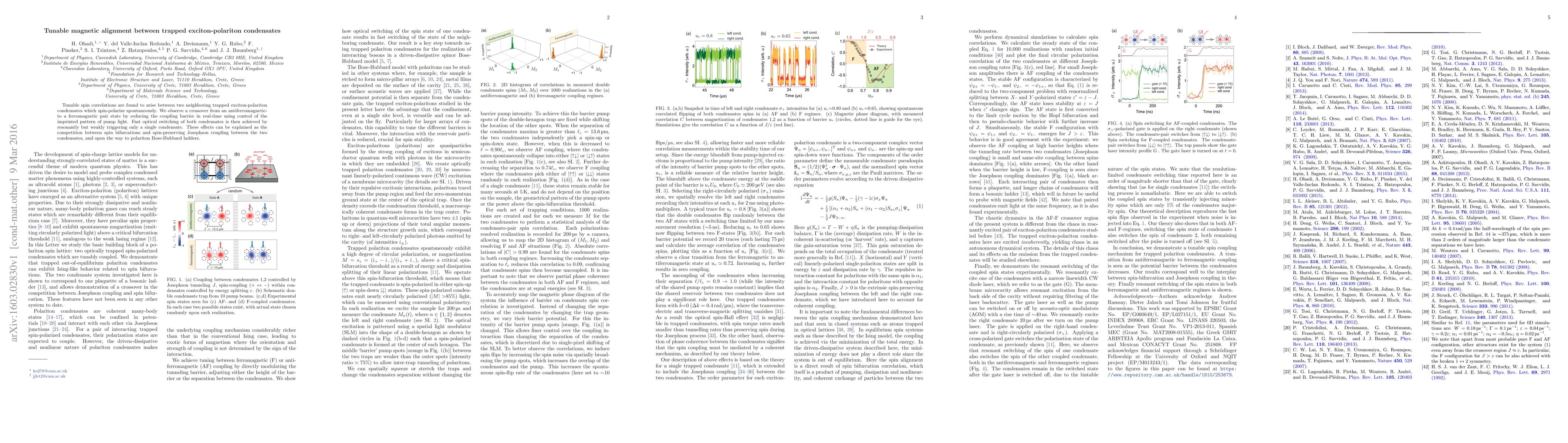 This paper investigates tunable magnetic alignment between two exciton-polariton condensates, revealing spin correlations that transition from antiferromagnetic to ferromagnetic by adjusting the coupling barrier. The study demonstrates optical switching of the condensates and attributes these effects to the interplay between spin bifurcations and Josephson coupling.