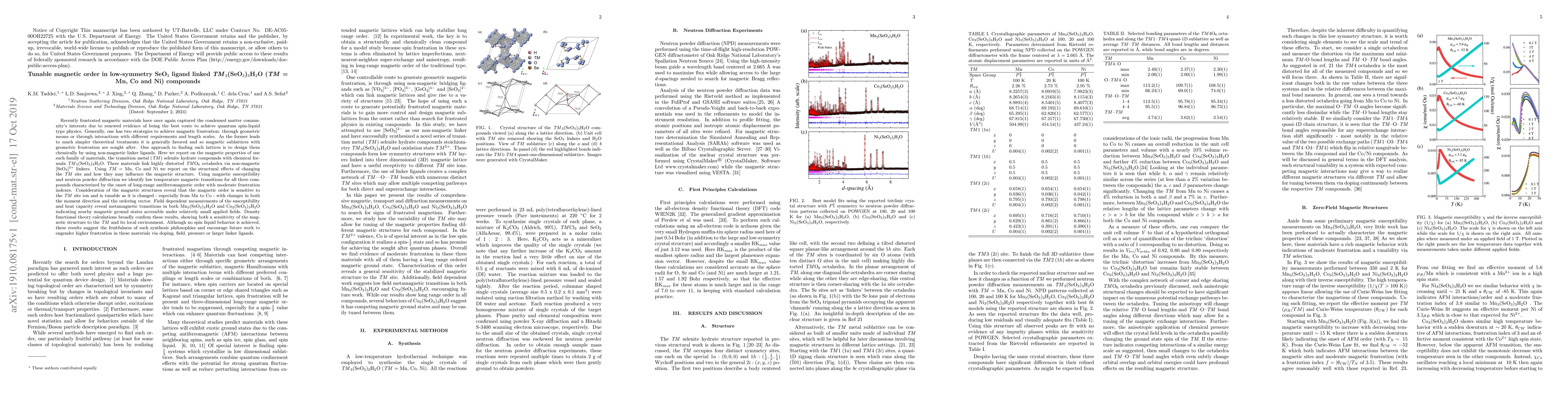 Researchers discovered a family of compounds with tunable magnetic order in low-symmetry SeO$_3$ ligand linked $TM_3$(SeO$_3$)$_3$H$_2$O compounds, exhibiting geometric frustration and metamagnetic transitions.