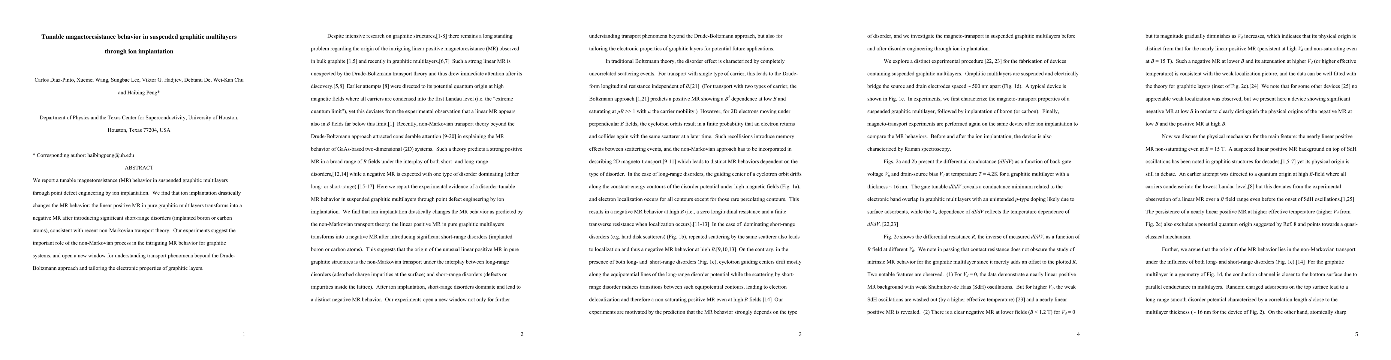 This study demonstrates tunable magnetoresistance behavior in suspended graphitic multilayers via ion implantation, transforming linear positive magnetoresistance to negative magnetoresistance through induced short-range disorders. The findings highlight the significance of non-Markovian processes in graphitic systems and suggest new avenues for manipulating electronic properties.