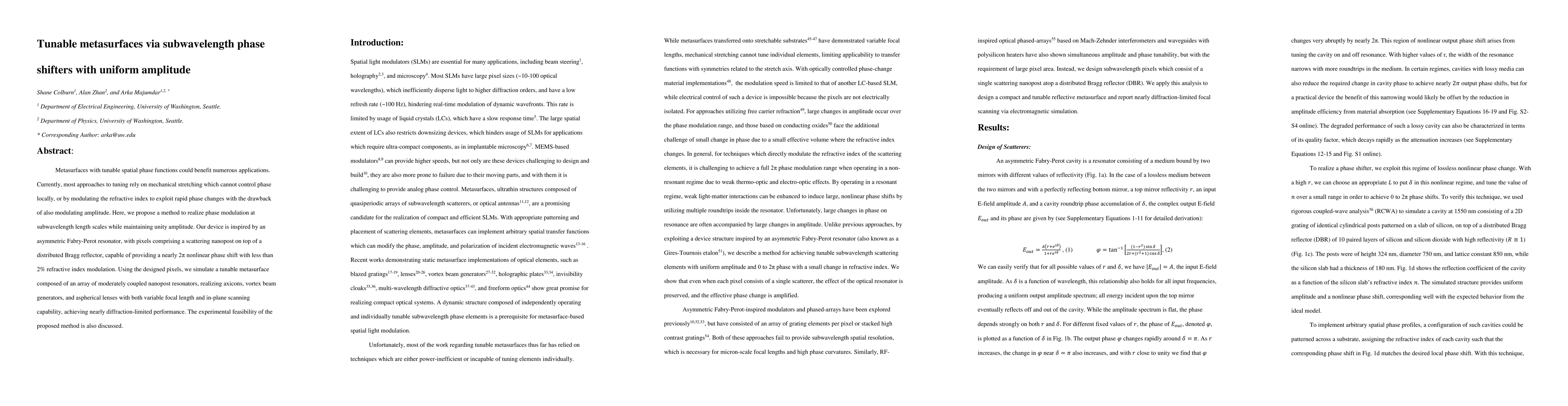 This paper proposes a tunable metasurface using subwavelength phase shifters that maintain uniform amplitude, inspired by asymmetric Fabry-Perot resonators. The method achieves a nearly 2π phase shift with minimal refractive index modulation, enabling applications like axicons, vortex beam generators, and aspherical lenses with variable focal length and in-plane scanning.