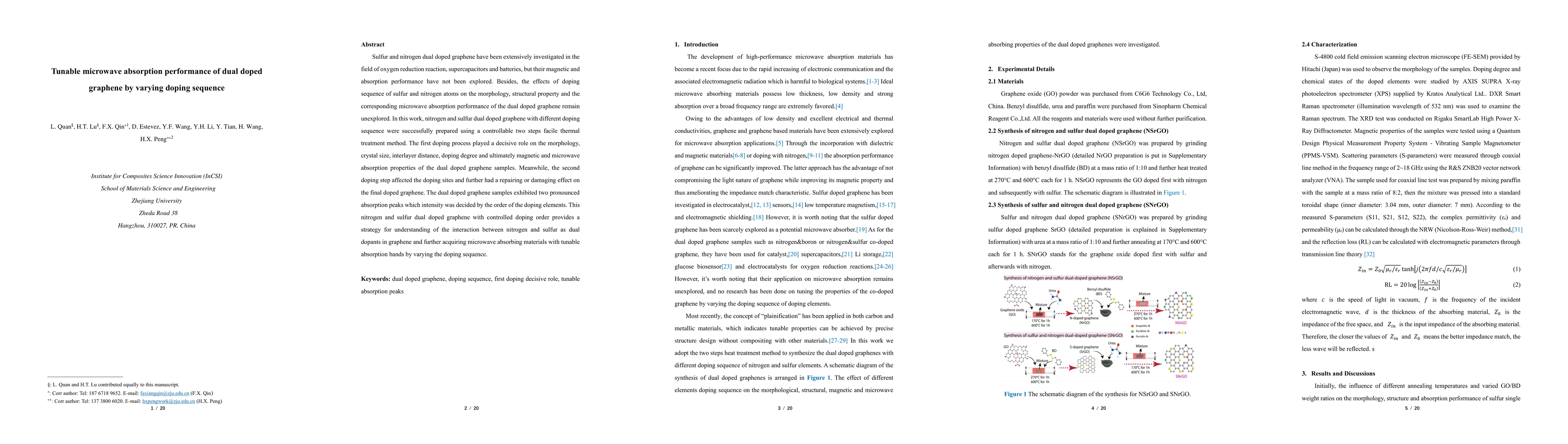 This study investigates the tunable microwave absorption performance of nitrogen and sulfur dual-doped graphene by altering the doping sequence. The controllable method reveals that the first doping step significantly impacts the material's morphology and microwave absorption properties, while the second step affects doping sites and may repair or damage the structure, ultimately influencing absorption peak intensity.