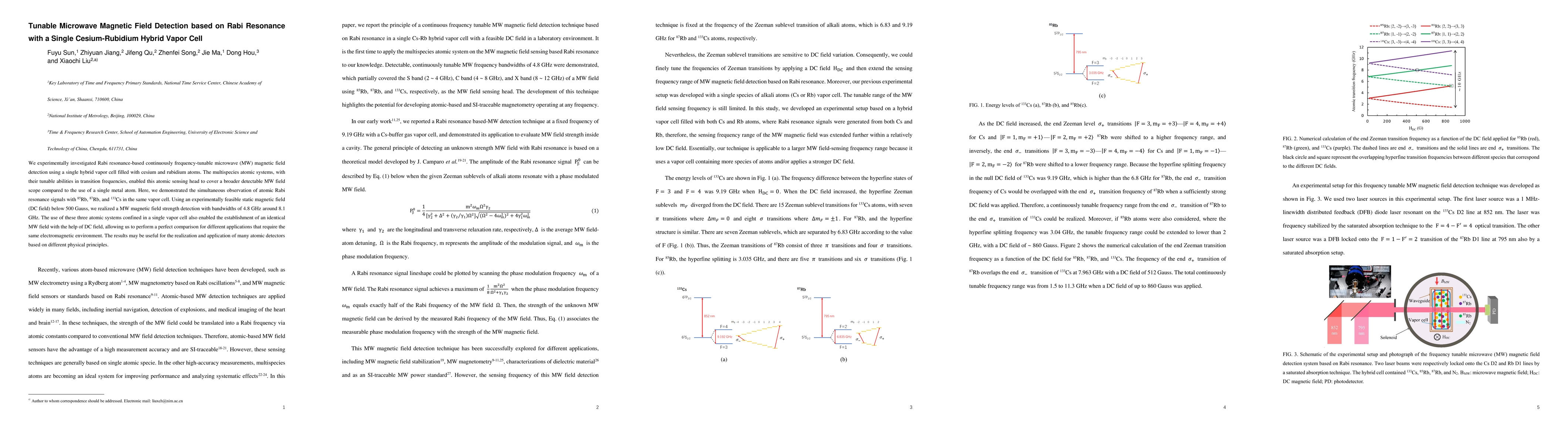 We experimentally investigated Rabi resonance-based continuously frequency-tunable microwave (MW) magnetic field detection using a single hybrid vapor cell filled with cesium and rubidium atoms. The multispecies atomic systems, with their tunable abilities in transition frequencies, enabled this atomic sensing head to cover a broader detectable MW field scope compared to the use of a single metal atom. Here, we demonstrated the simultaneous observation of atomic Rabi resonance signals with 85Rb, 87Rb, and 133Cs in the same vapor cell. Using an experimentally feasible static magnetic field (DC field) below 500 Gauss, we realized a MW magnetic field strength detection with bandwidths of 4.8 GHz around 8.1 GHz. The use of these three atomic systems confined in a single vapor cell also enabled the establishment of an identical MW field with the help of DC field, allowing us to perform a perfect comparison for different applications that require the same electromagnetic environment. The results may be useful for the realization and application of many atomic detectors based on different physical principles.