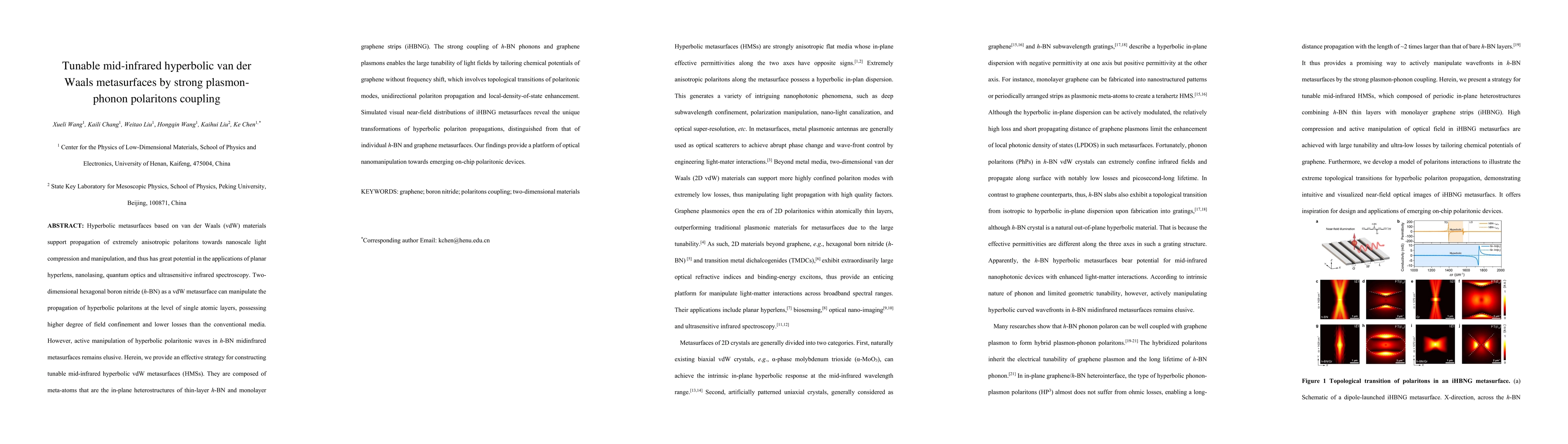 This paper presents a strategy for creating tunable mid-infrared hyperbolic van der Waals metasurfaces (HMSs) by coupling h-BN phonons with graphene plasmons in in-plane heterostructures, enabling large tunability of light fields through graphene's chemical potential adjustments without frequency shifts. The resulting iHBNG metasurfaces facilitate unique transformations in hyperbolic polariton propagation, offering potential for advanced on-chip polaritonic devices.