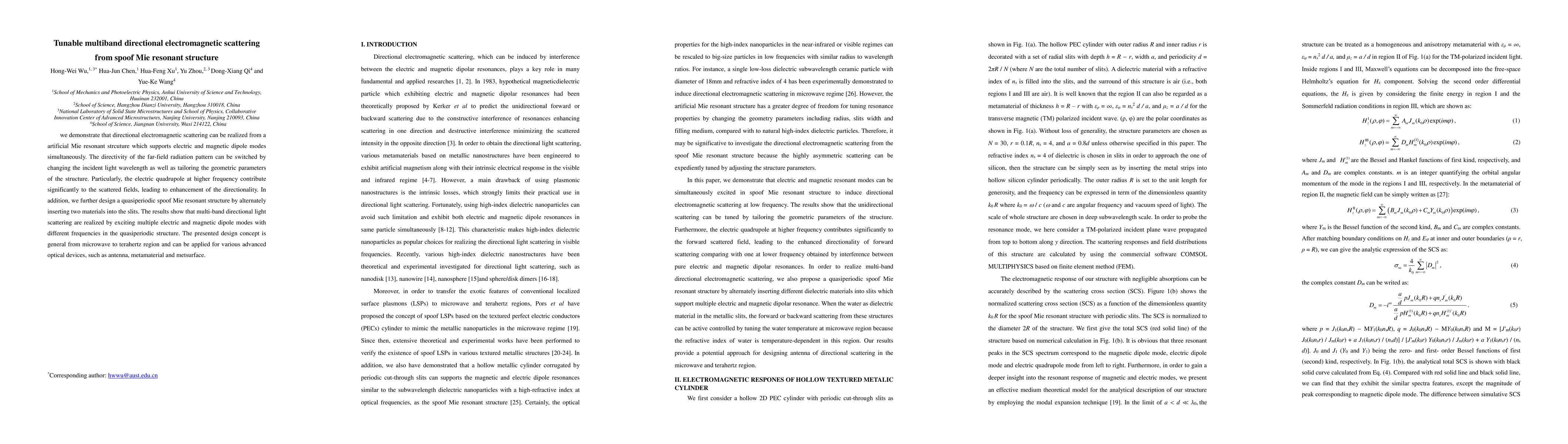 We demonstrate that directional electromagnetic scattering can be realized from a artificial Mie resonant strcuture which supports electric and magnetic dipole modes simultaneously. The directivity of the far-field radiation pattern can be switched by changing the incident light wavelength as well as tailoring the geometric parameters of the structure. Particularly, the electric quadrupole at higher frequency contribute significantly to the scattered fields, leading to enhancement of the directionality. In addition, we further design a quasiperiodic spoof Mie resonant structure by alternately inserting two materials into the slits. The results show that multi-band directional light scattering are realized by exciting multiple electric and magnetic dipole modes with different frequencies in the quasiperiodic structure. The presented design concept is general from microwave to terahertz region and can be applied for various advanced optical devices, such as antenna, metamaterial and metsurface.