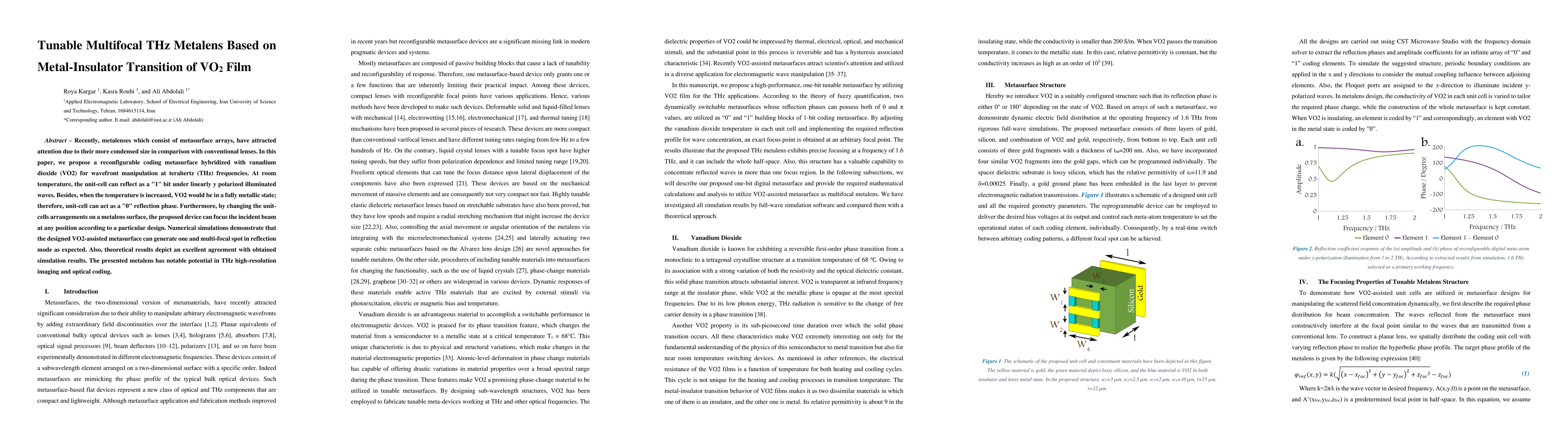 Recently, metalenses which consist of metasurface arrays, have attracted attention due to their more condensed size in comparison with conventional lenses. In this paper, we propose a reconfigurable coding metasurface hybridized with vanadium dioxide (VO2) for wavefront manipulation at terahertz (THz) frequencies. At room temperature, the unit-cell can reflect as a "1" bit under linearly y polarized illuminated waves. Besides, when the temperature is increased, VO2 would be in a fully metallic state; therefore, unit-cell can act as a "0" reflection phase. Furthermore, by changing the unit-cells arrangements on a metalens surface, the proposed device can focus the incident beam at any position according to a particular design. Numerical simulations demonstrate that the designed VO2-assisted metasurface can generate one and multi-focal spot in reflection mode as expected. Also, theoretical results depict an excellent agreement with obtained simulation results. The presented metalens has notable potential in THz high-resolution imaging and optical coding.