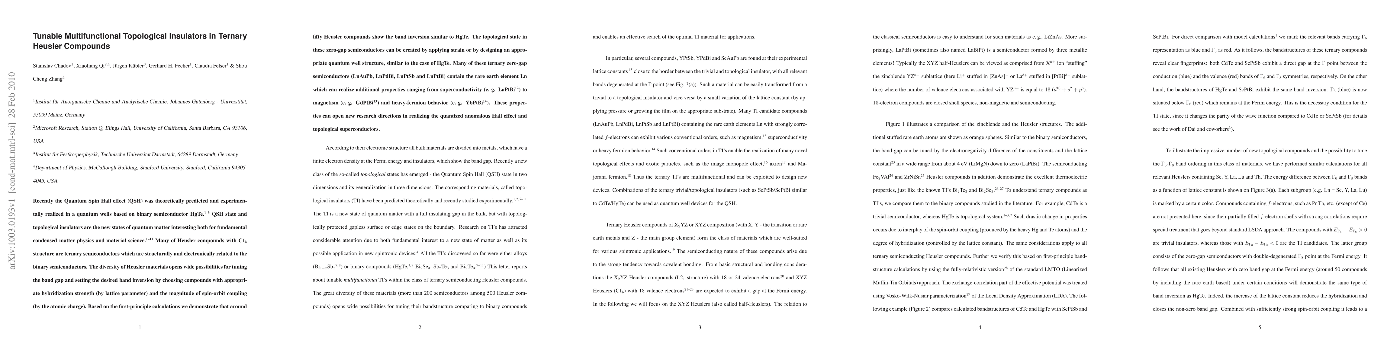 Recently the Quantum Spin Hall effect (QSH) was theoretically predicted and experimentally realized in a quantum wells based on binary semiconductor HgTe[1-3]. QSH state and topological insulators are the new states of quantum matter interesting both for fundamental condensed matter physics and material science[1-11]. Many of Heusler compounds with C1b structure are ternary semiconductors which are structurally and electronically related to the binary semiconductors. The diversity of Heusler materials opens wide possibilities for tuning the band gap and setting the desired band inversion by choosing compounds with appropriate hybridization strength (by lattice parameter) and the magnitude of spin-orbit coupling (by the atomic charge). Based on the first-principle calculations we demonstrate that around fifty Heusler compounds show the band inversion similar to HgTe. The topological state in these zero-gap semiconductors can be created by applying strain or by designing an appropriate quantum well structure, similar to the case of HgTe. Many of these ternary zero-gap semiconductors (LnAuPb, LnPdBi, LnPtSb and LnPtBi) contain the rare earth element Ln which can realize additional properties ranging from superconductivity (e. g. LaPtBi[12]) to magnetism (e. g. GdPtBi[13]) and heavy-fermion behavior (e. g. YbPtBi[14]). These properties can open new research directions in realizing the quantized anomalous Hall effect and topological superconductors.